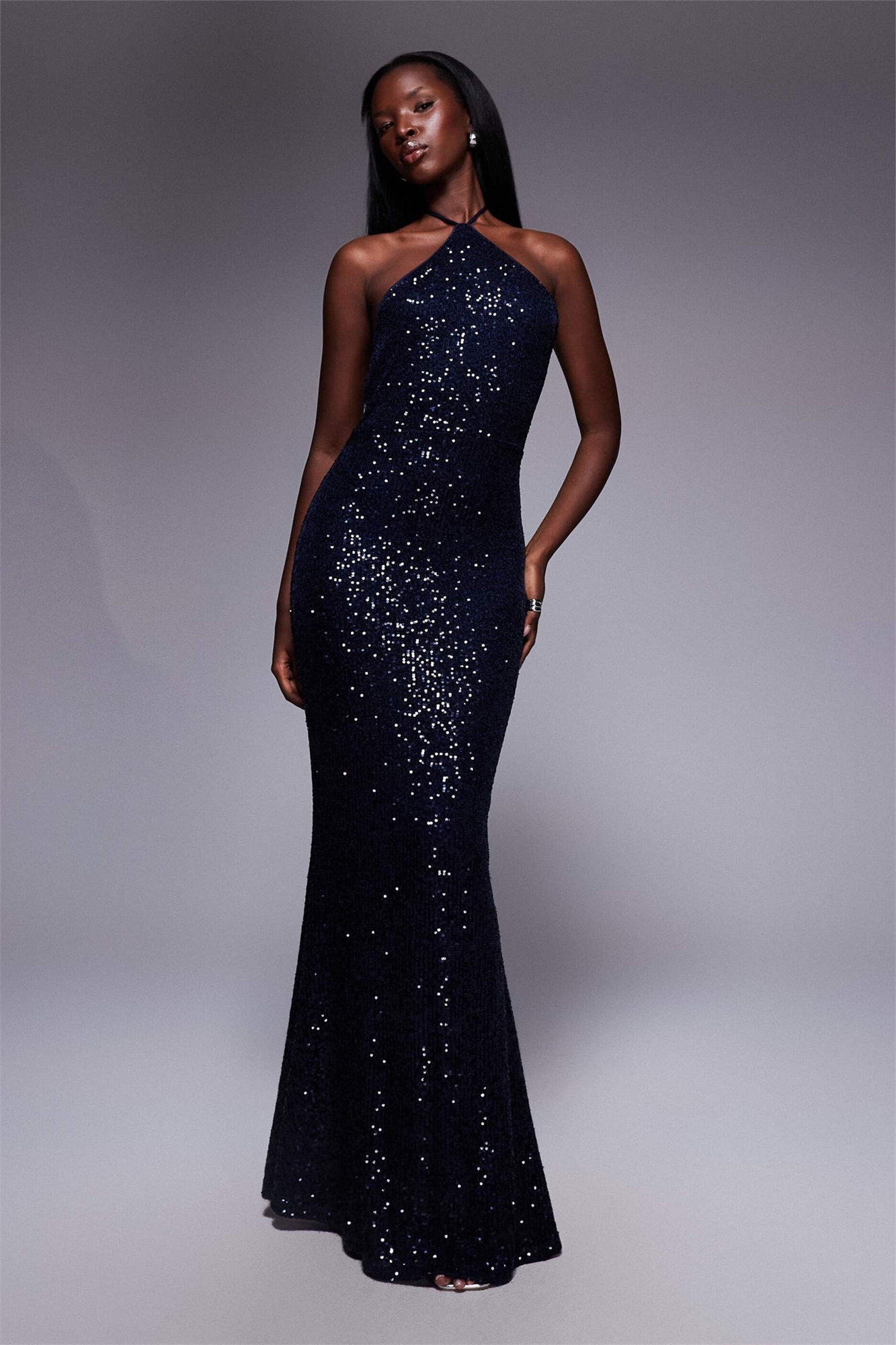 Макси-платье с открытыми плечами, полностью покрытое пайетками