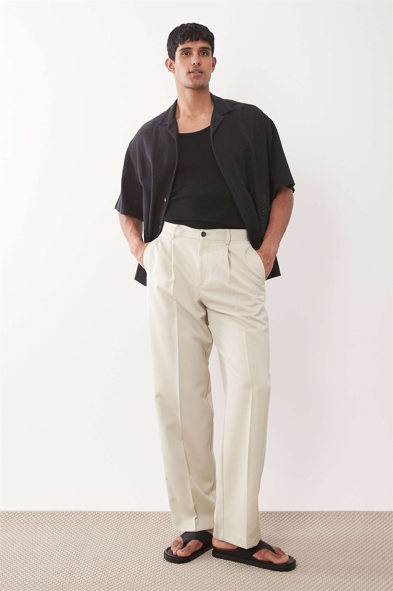 Стильные брюки с широкими брючинами и складками, с открытой пуговицей