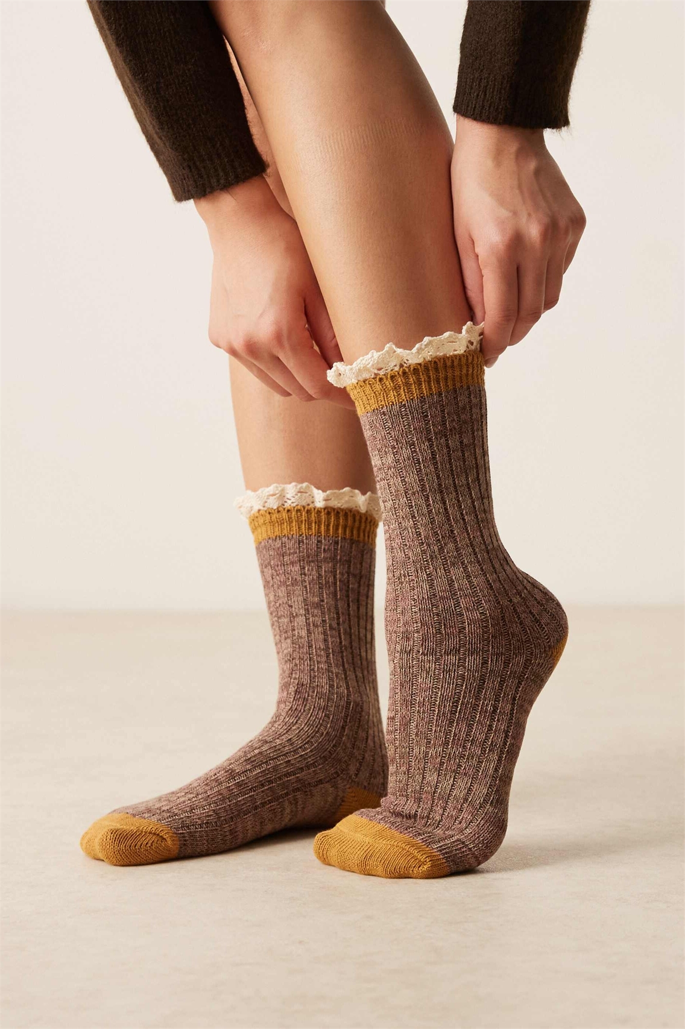 Уютные носки с ребристой вязкой и оборкой, связанной крючком