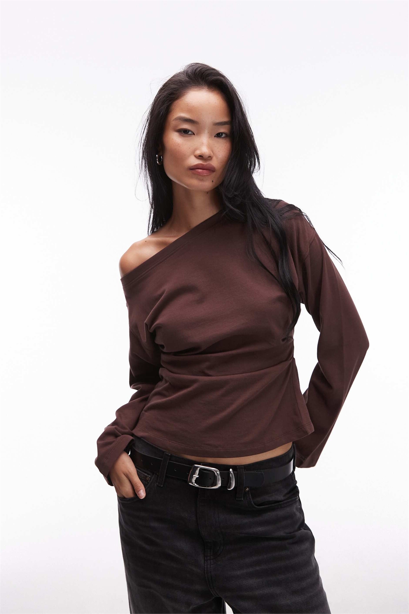 Футболка с длинными рукавами, открытыми плечами и зауженной талией