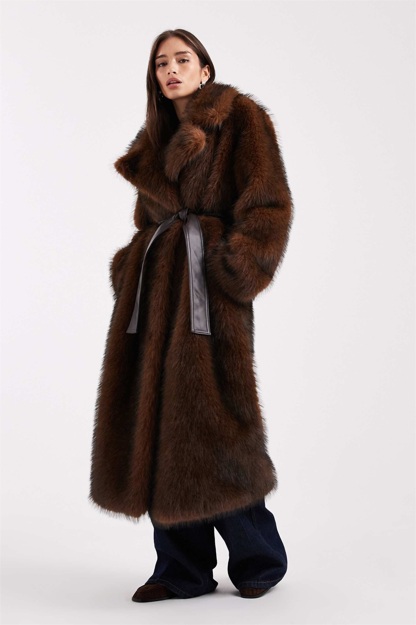 Длинная куртка из искусственного меха с поясом