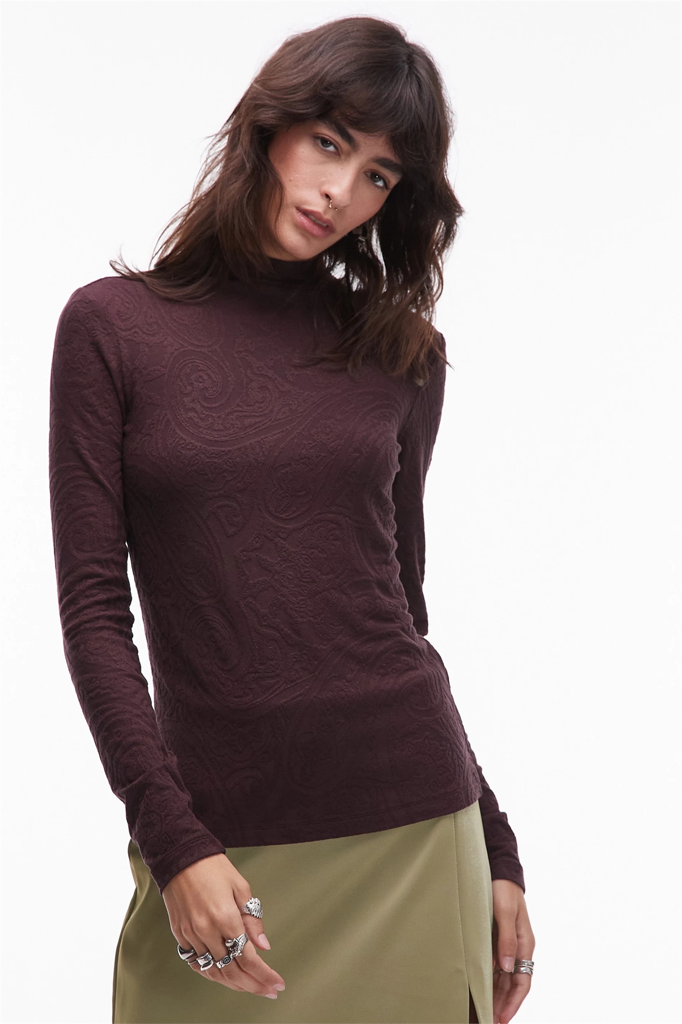 Текстурированный жаккардовый джерси. Основной состав: 95% вискоза, 5% эластан.