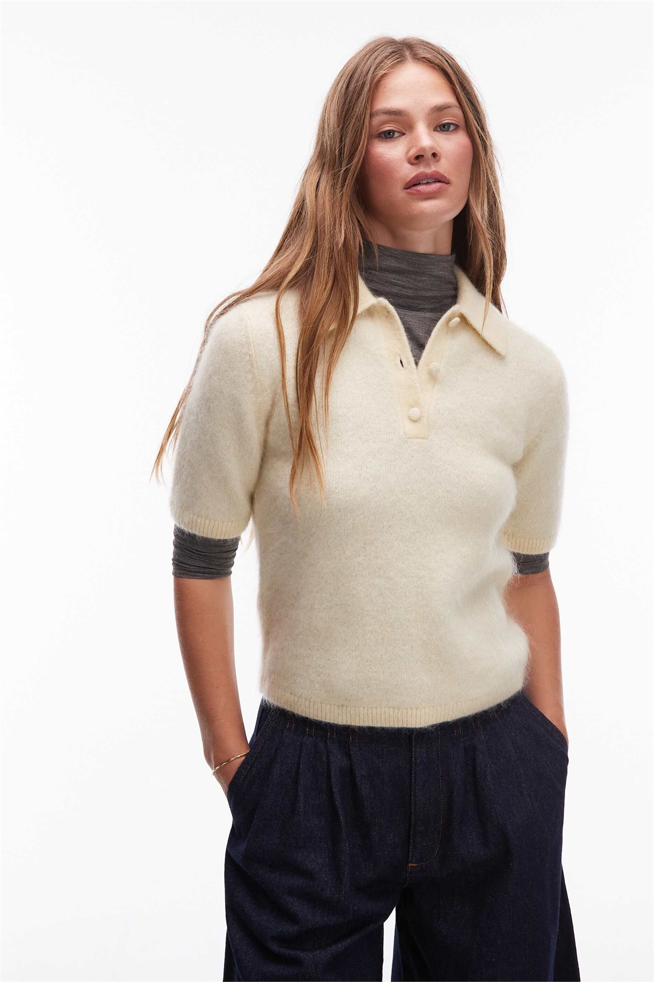 Свитер облегающего кроя из мохера и шерсти с воротником-поло
