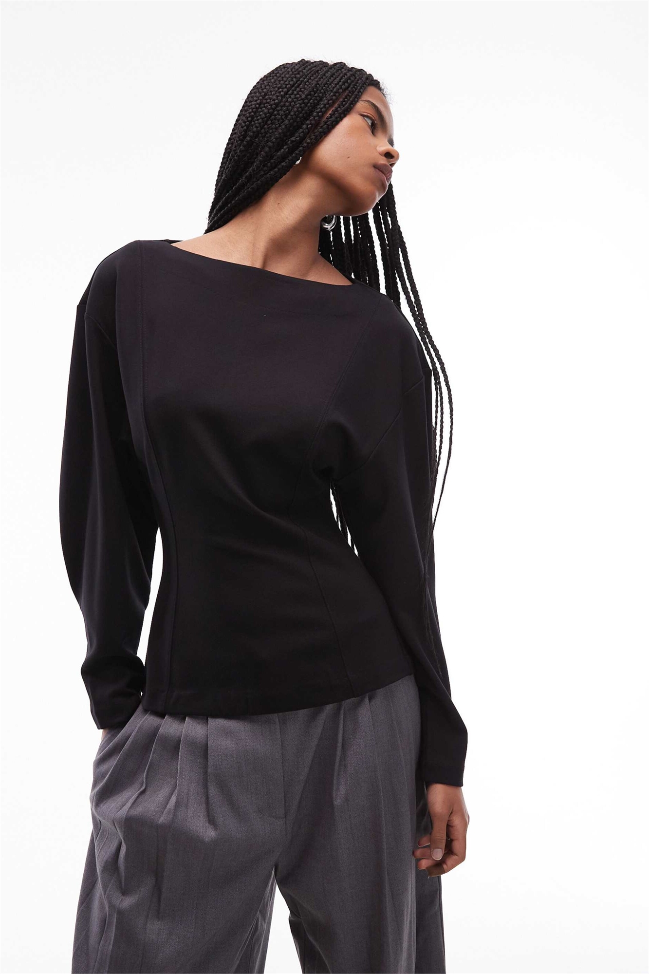 Черный топ с длинными рукавами, лодочным вырезом и драпировкой