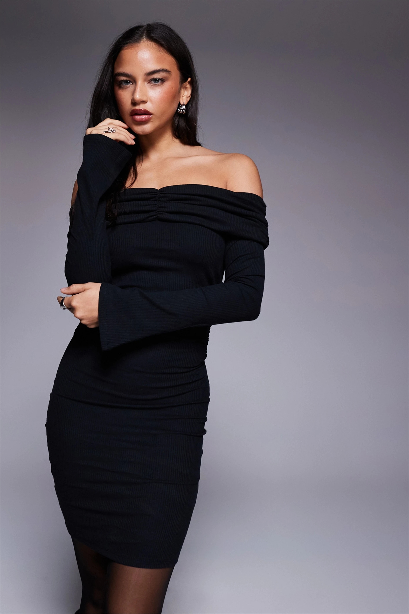 Мини-платье с ребристым рюшами и открытыми плечами