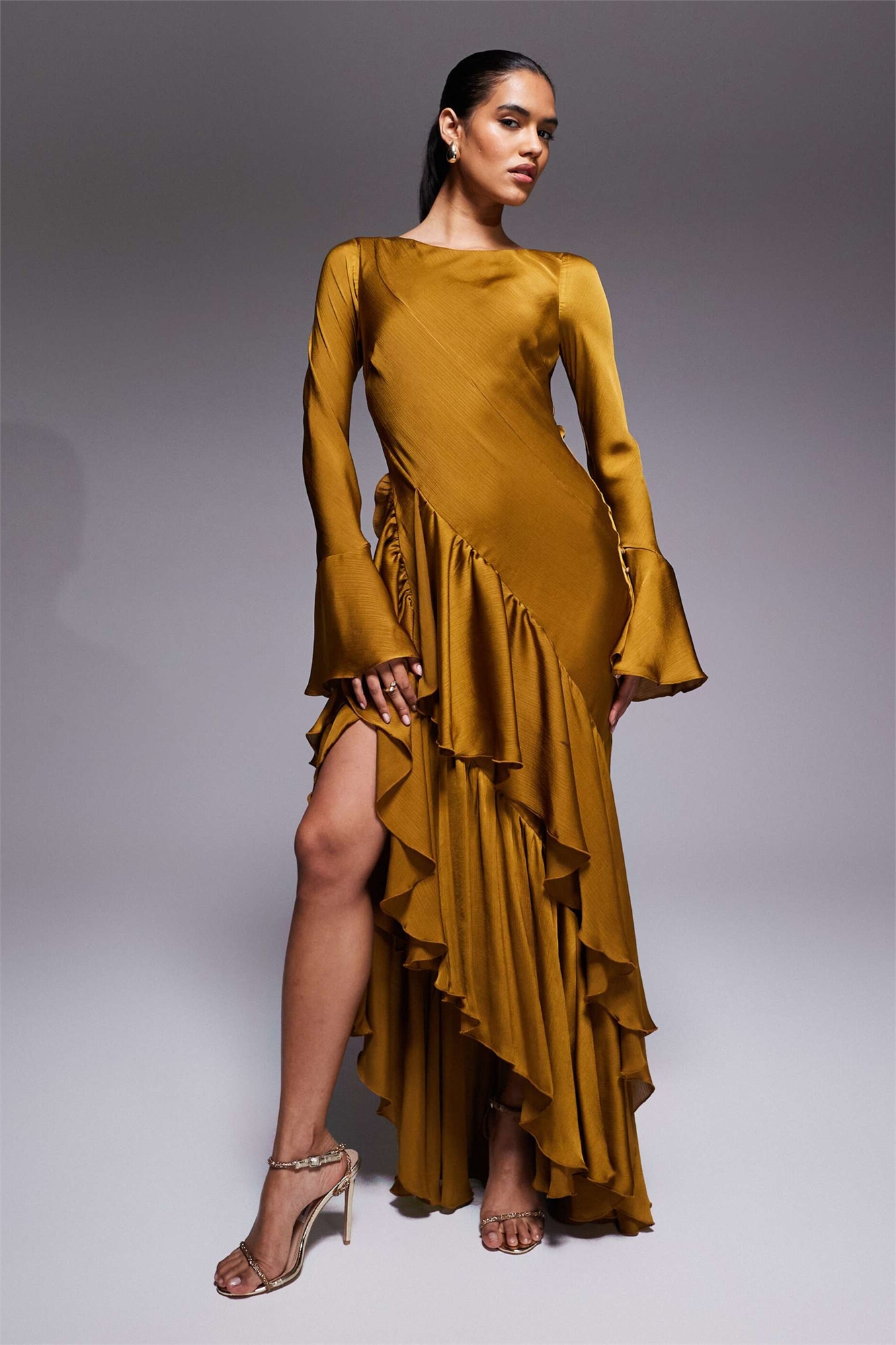 Макси-платье с длинными рукавами, оборками и открытой спиной