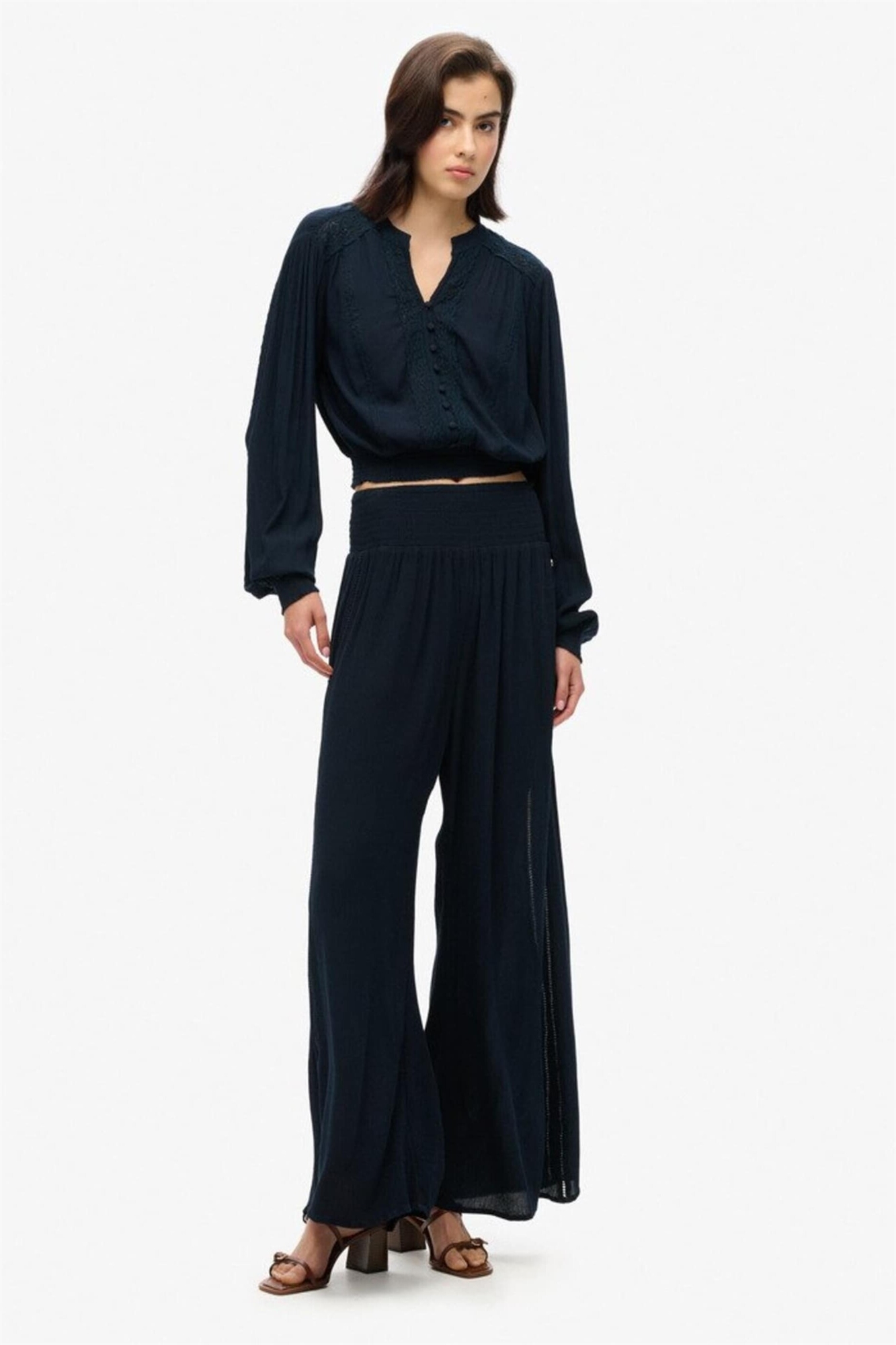 Блузка с длинными рукавами, кружевной отделкой и сборками
