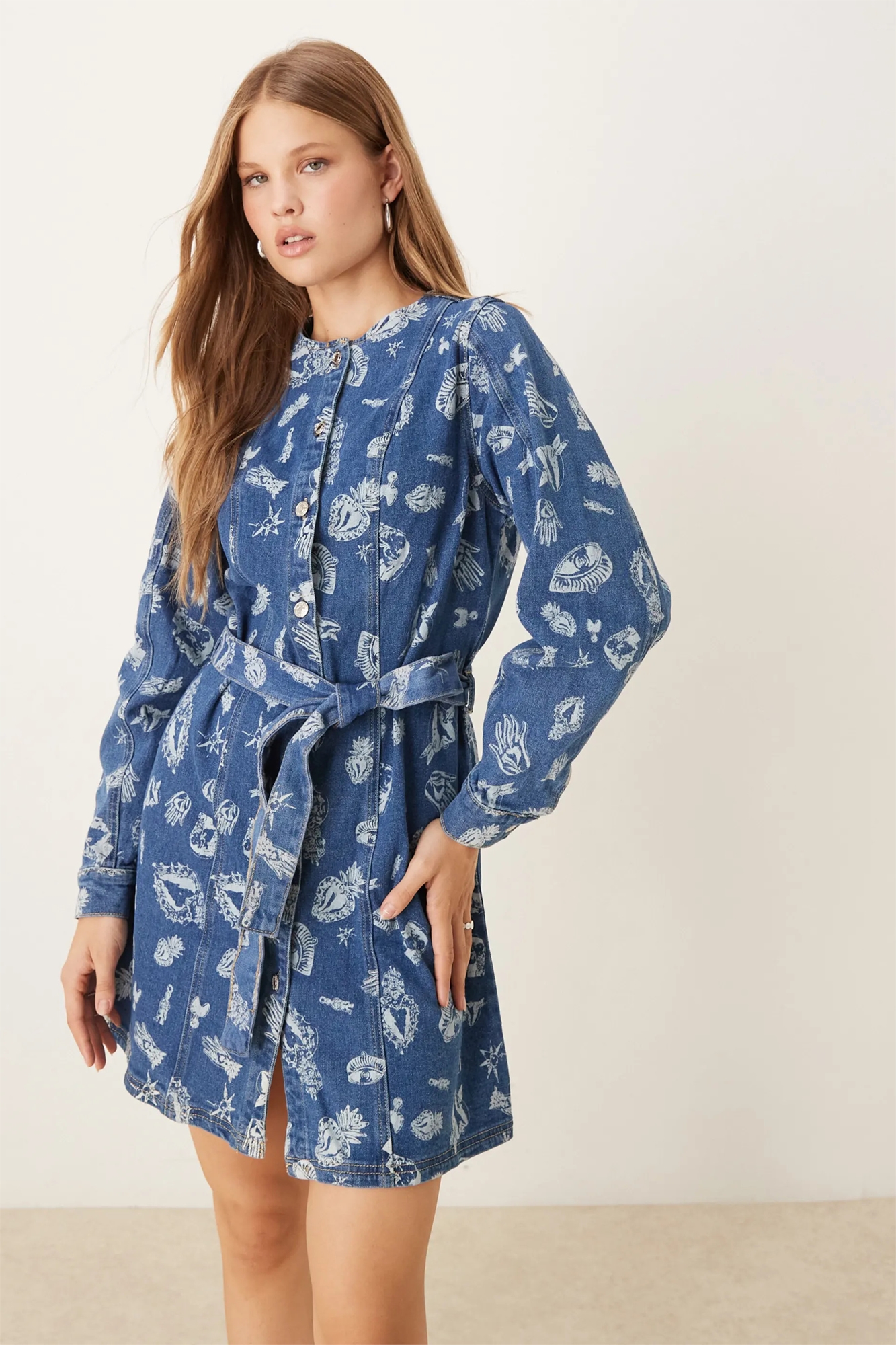 Мини-платье из денима с завязкой на талии