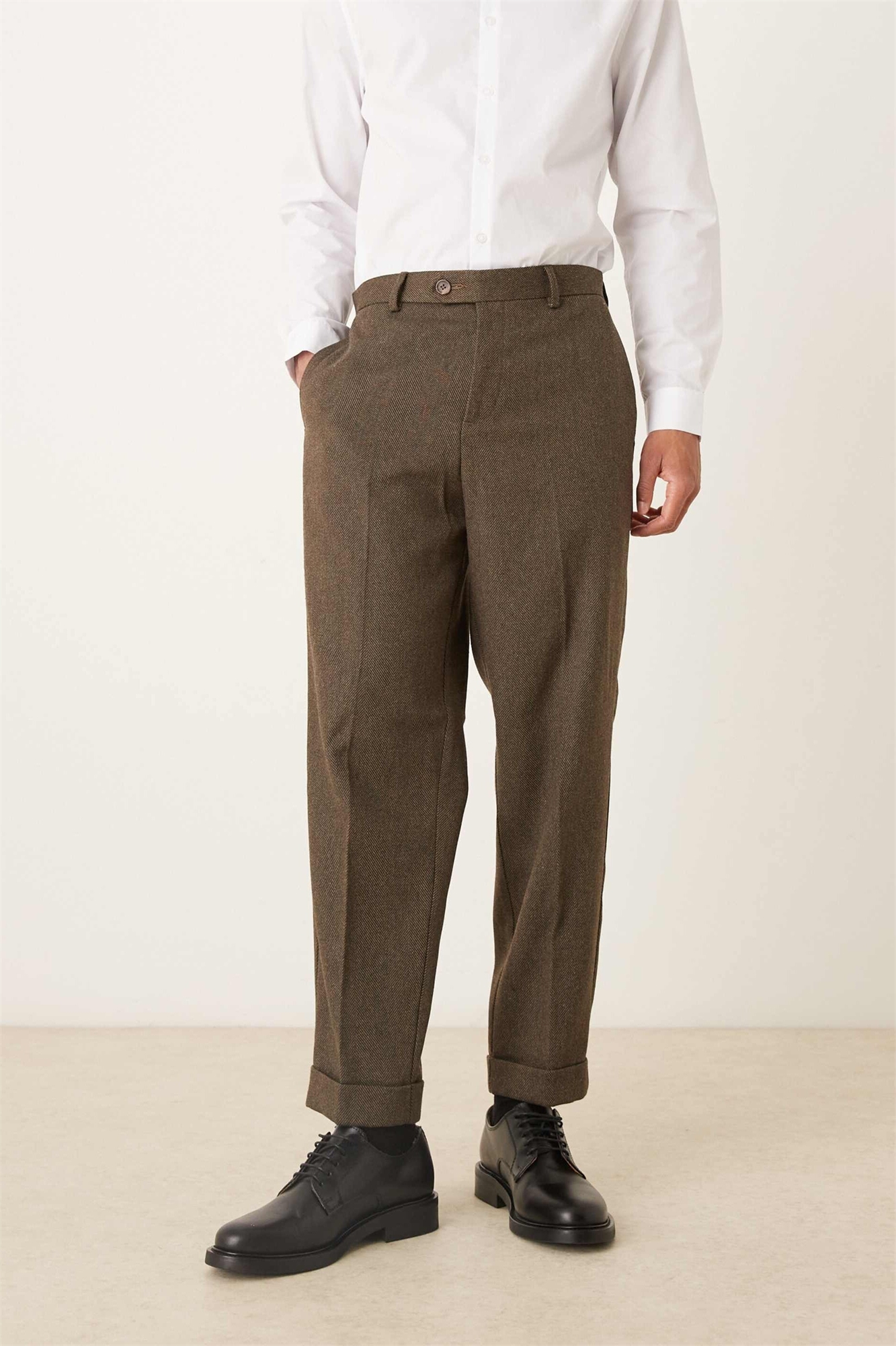 Стильные брюки свободного кроя с зауженными штанинами, открытой застежкой на пуговицы и отворотами