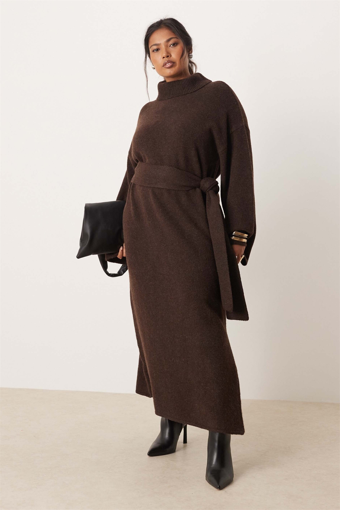 Плетеное платье средней длины с завязкой на талии, высоким воротником и разрезом на ноге