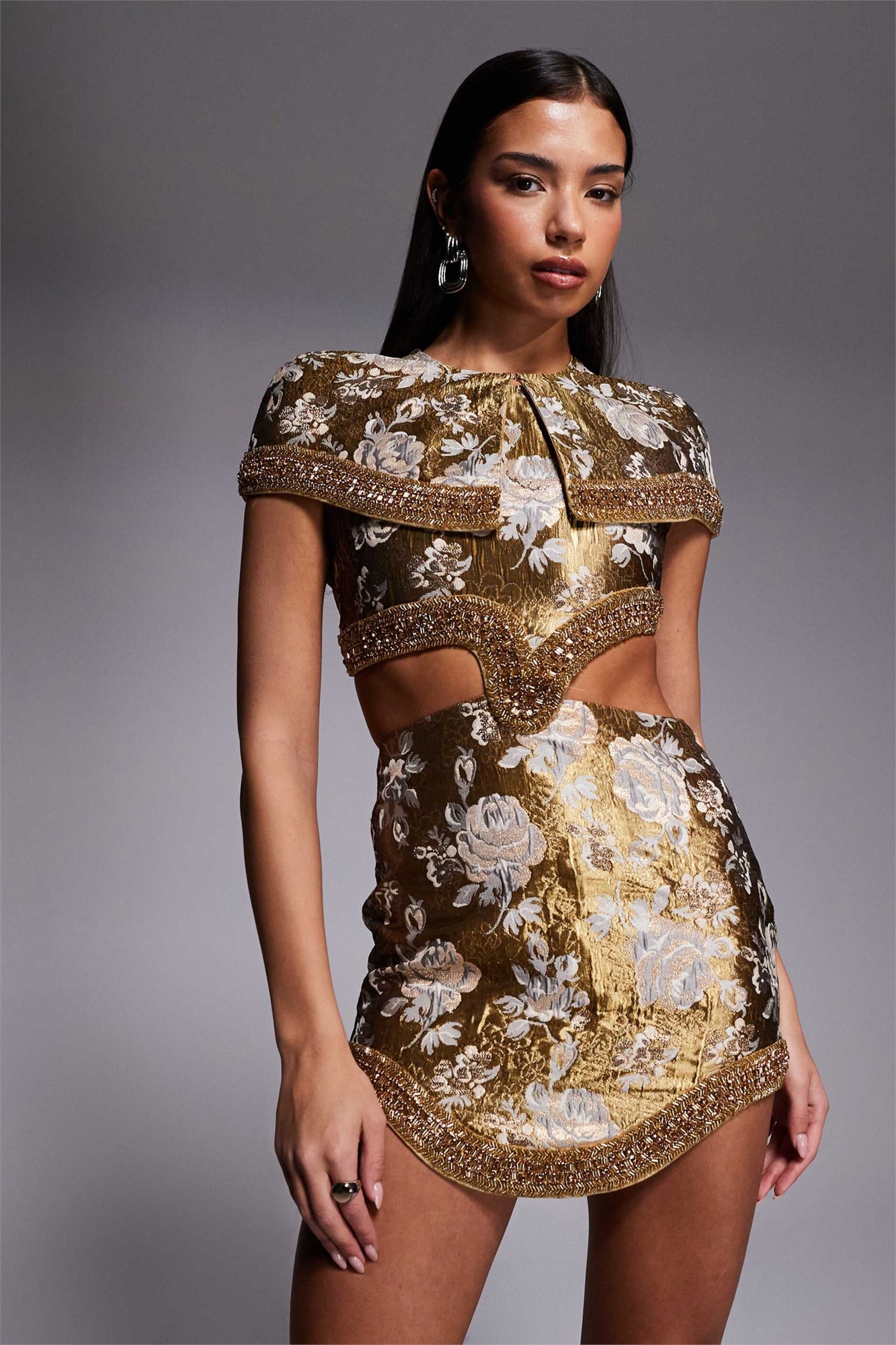 Мини-платье из жаккарда с декором в виде мыса и фигурным подолом