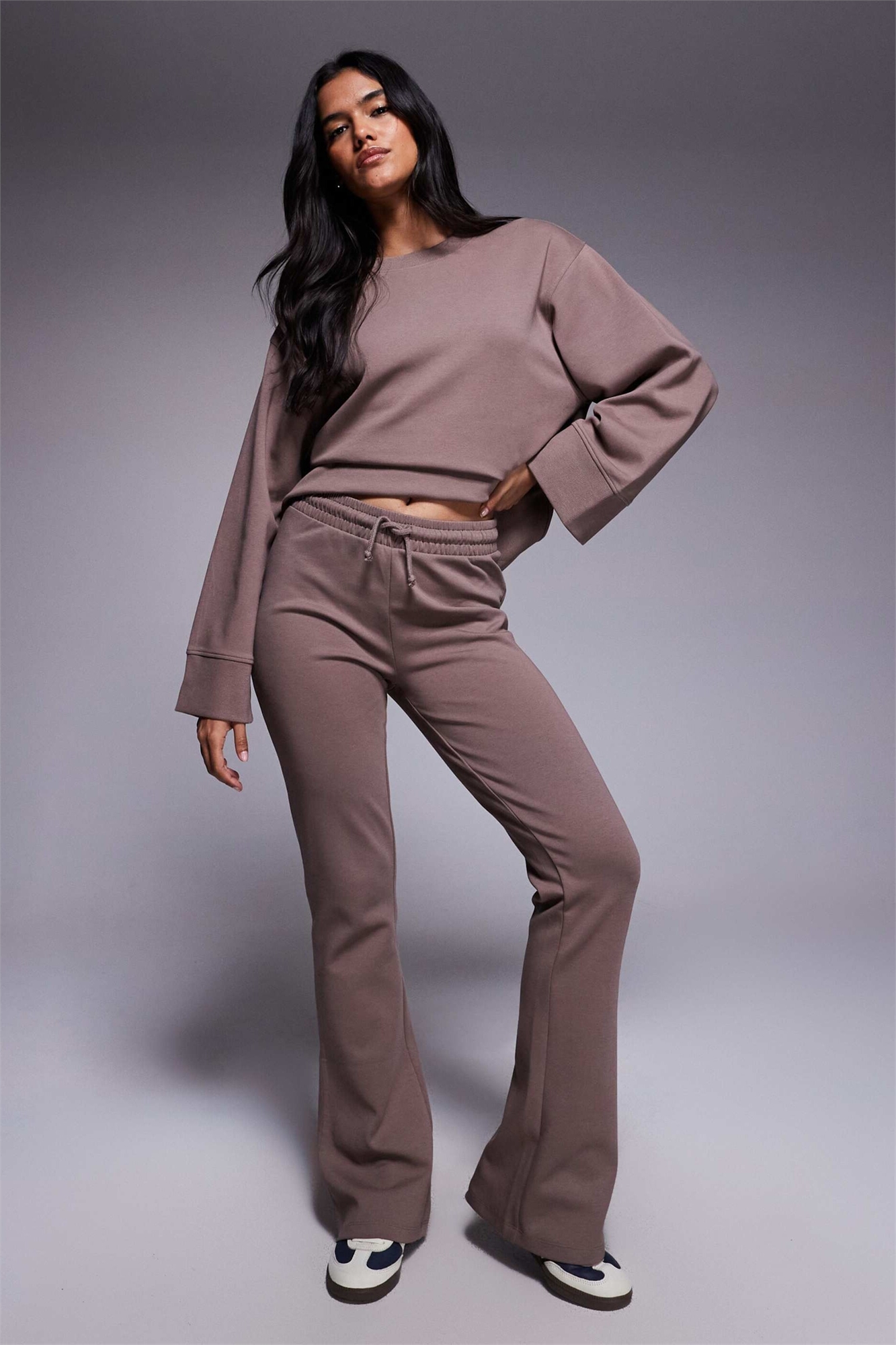 Джоггеры с расклешенными штанинами и застежкой-молнией, темно-серо-коричневого цвета co-ord