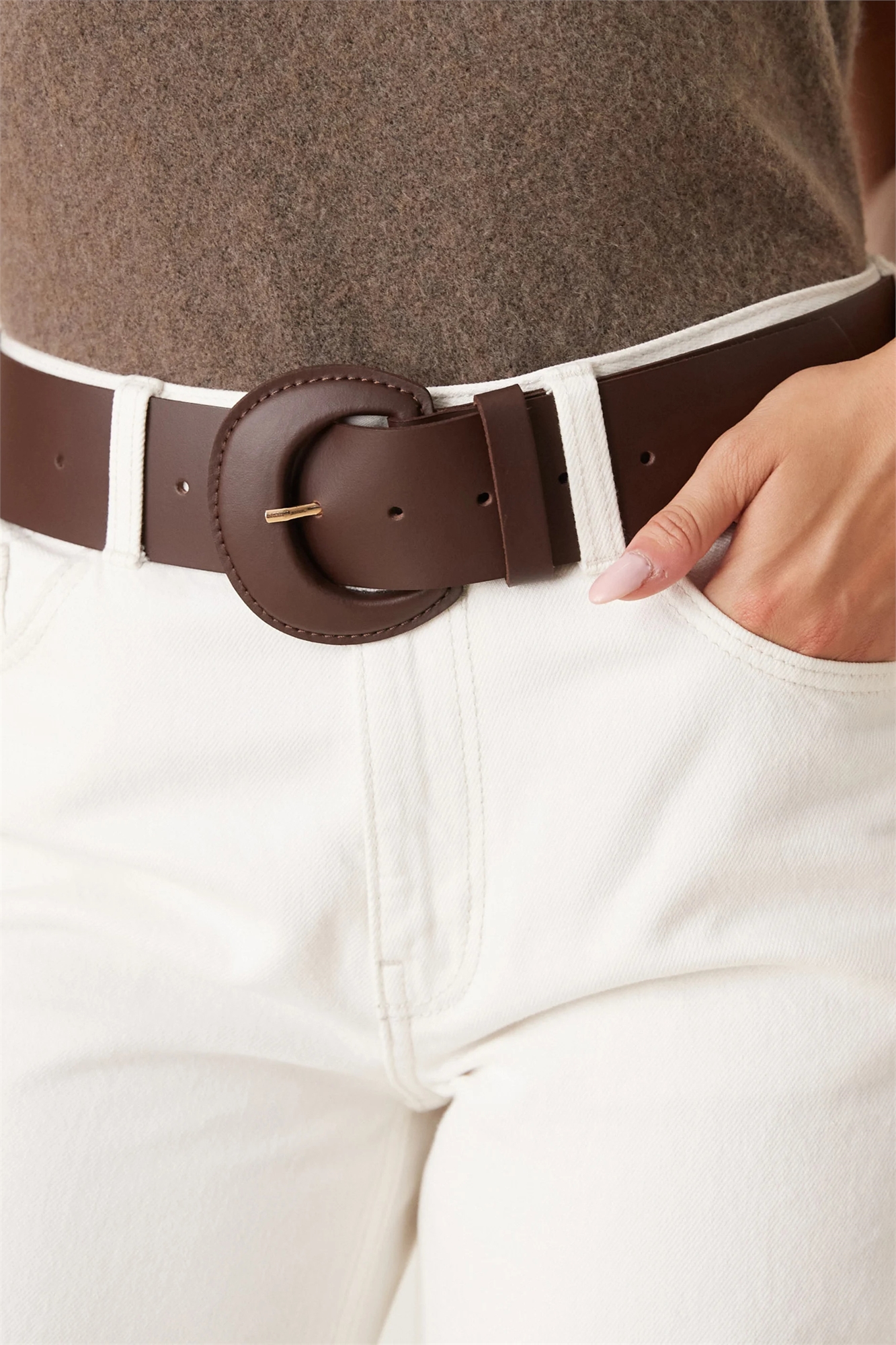 Широкий кожаный пояс на талии и бедрах с закрытой пряжкой
