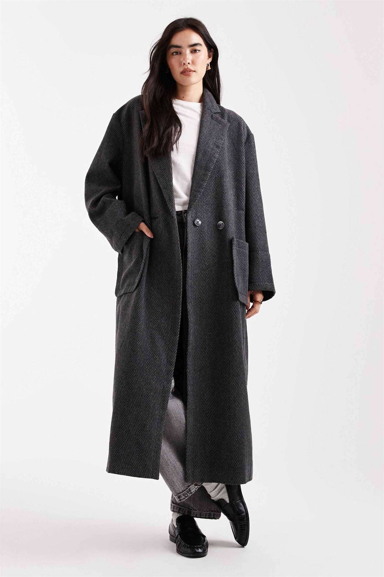 Объемное пальто-кокон с узором «елочка» и глубокими отворотами на манжетах