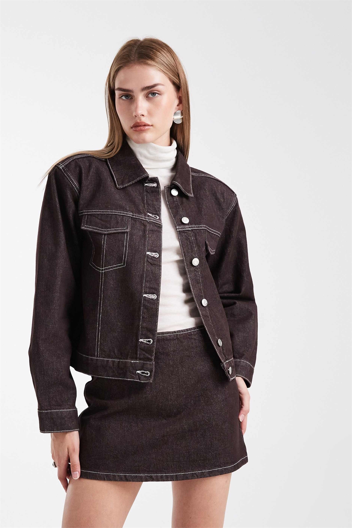 Джинсовая куртка прямого кроя с плечевыми накладками темно-коричневого цвета