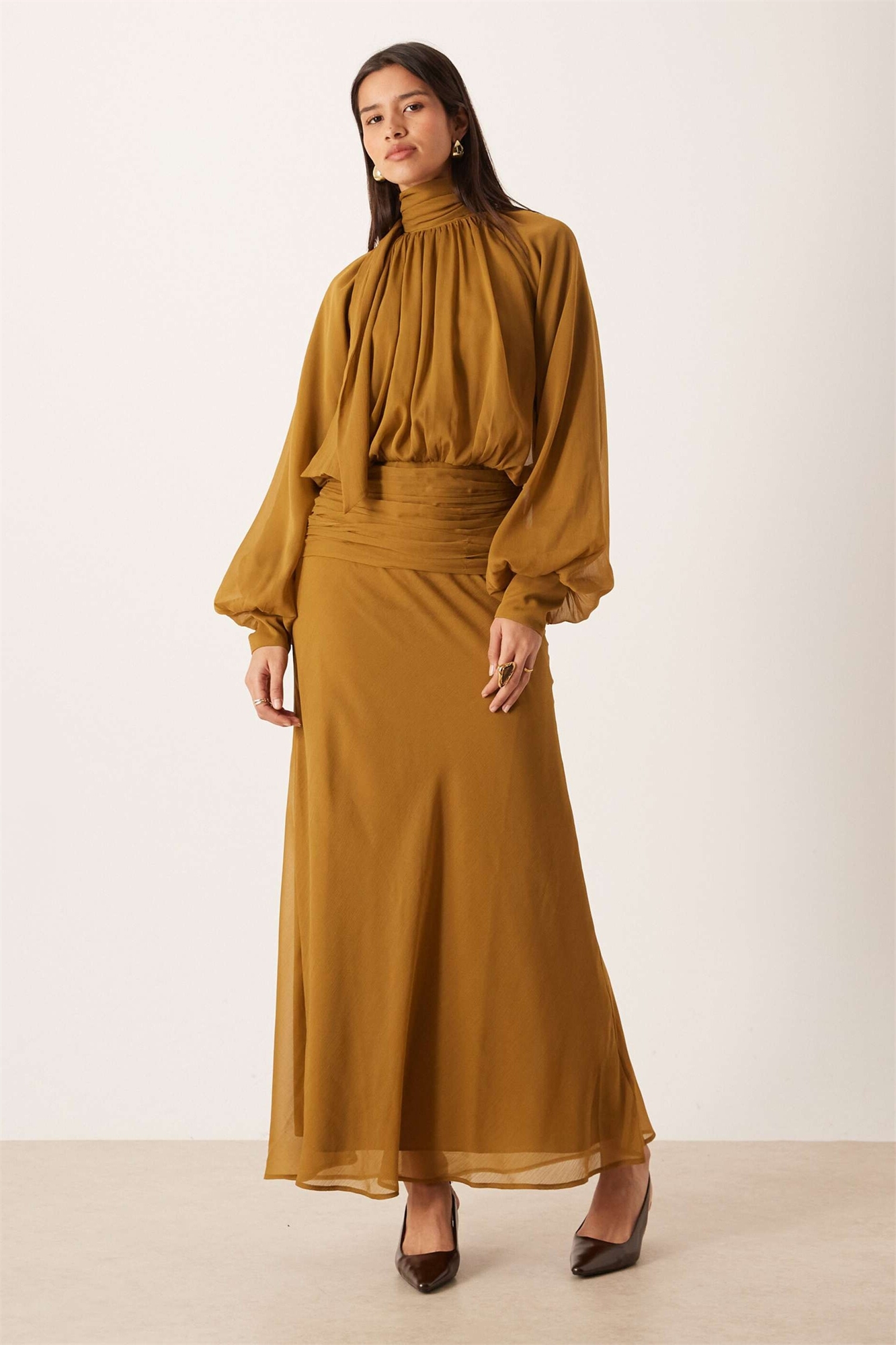 Макси-платье из шифона с высоким воротником и завязками на шее