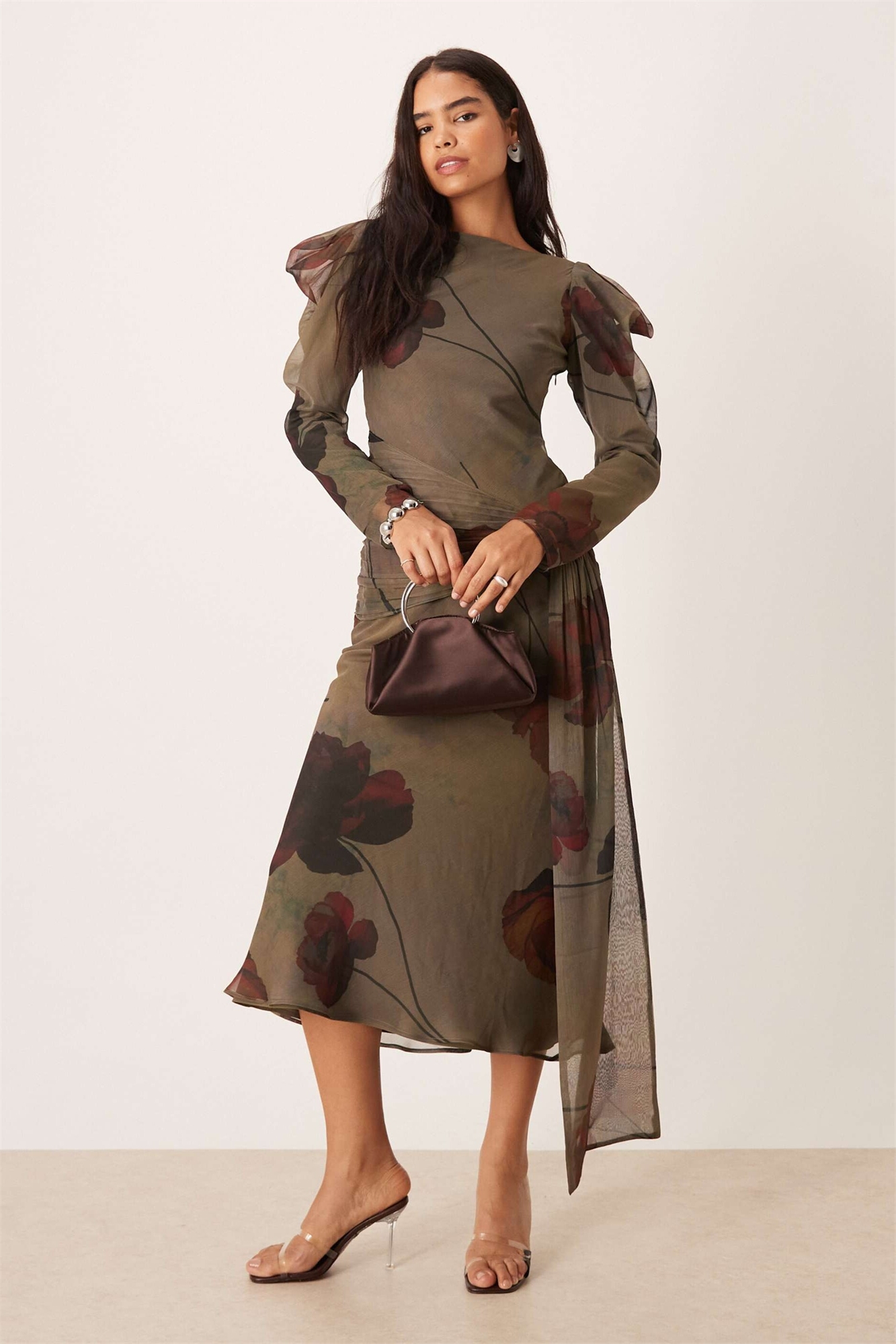 Шифон: мягкая, драпируемая, прозрачная ткань с сухим ощущением на ощупь. Основной материал: 100% полиэстер, подкладка: 100% полиэстер.