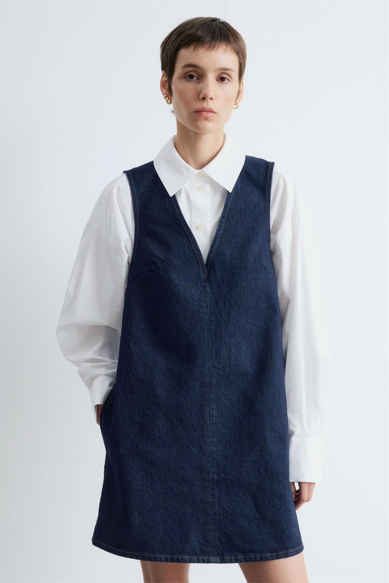 Мини-платье из эластичного денима с V-образным вырезом и швом спереди