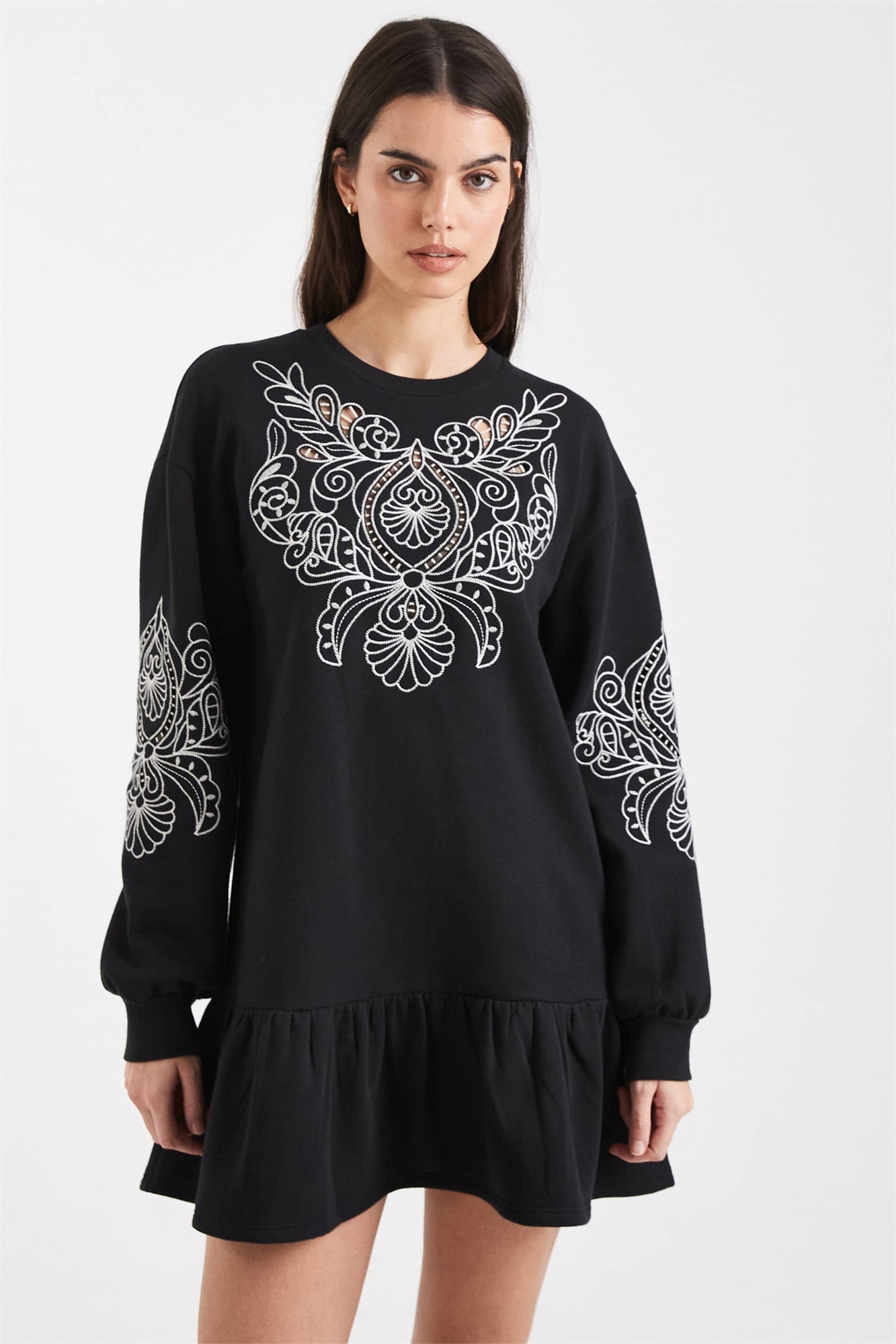 Платье-свитшот с вырезанной вышивкой и заниженной талией