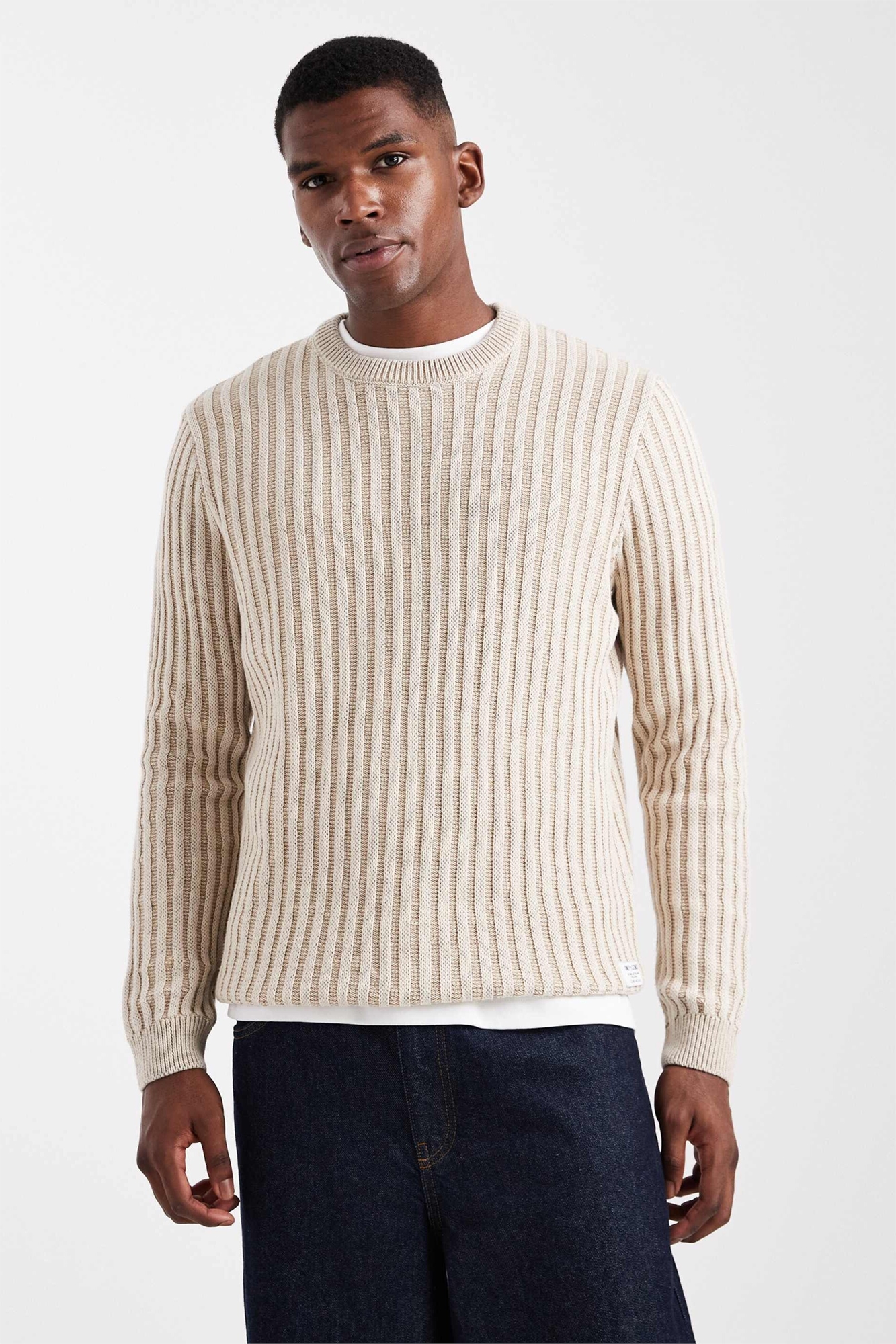 Толстый трикотаж с ребристой фактурой. Основной состав: 70% хлопок, 30% полиэстер.