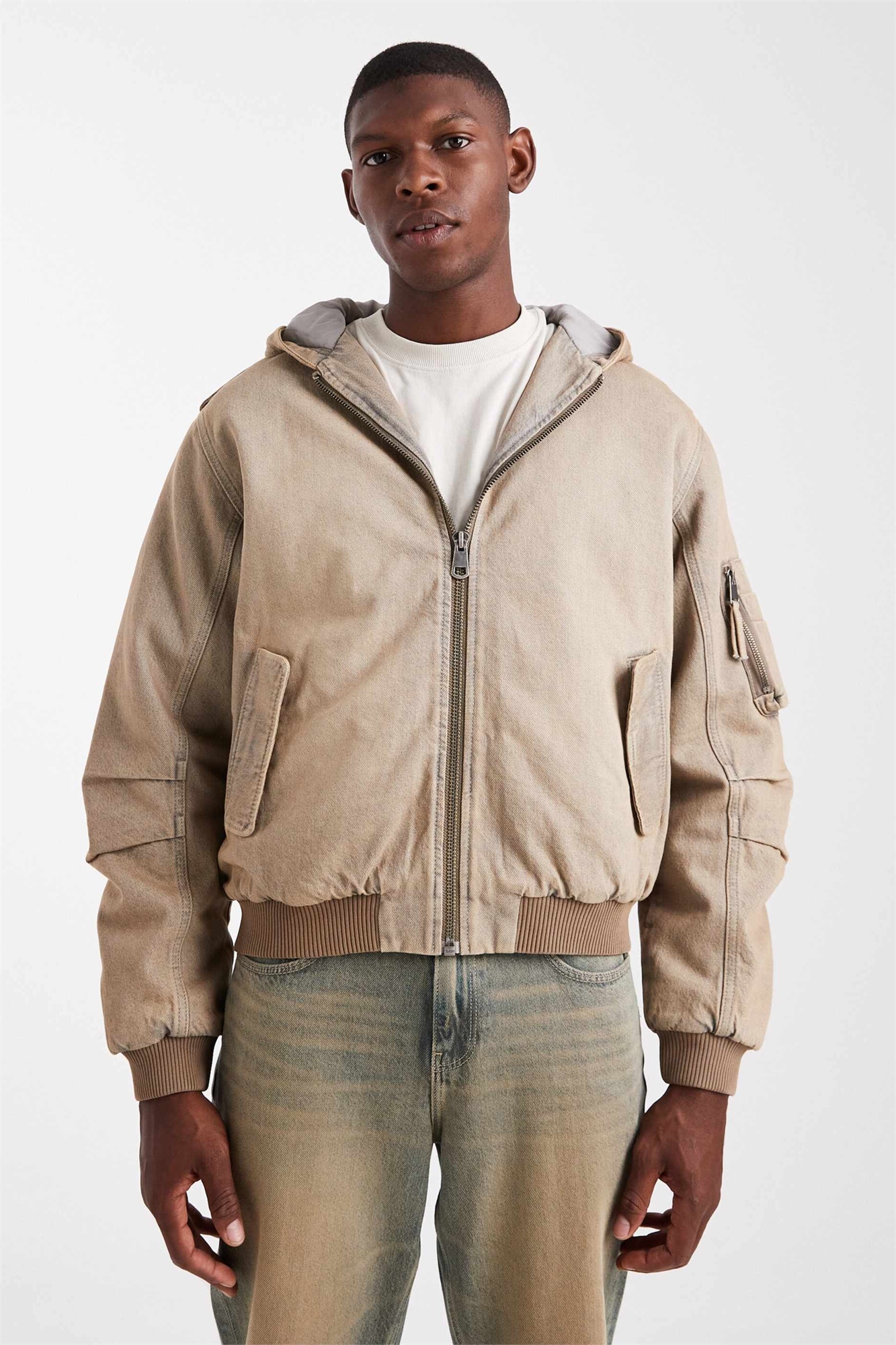 Джинсовая куртка-бомбер с капюшоном