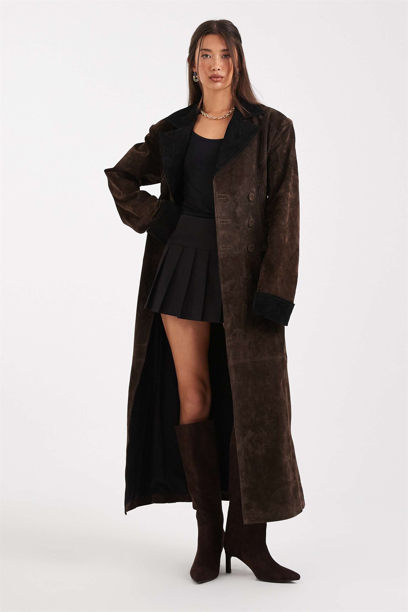 Длинное пальто из замши с двойной застежкой
