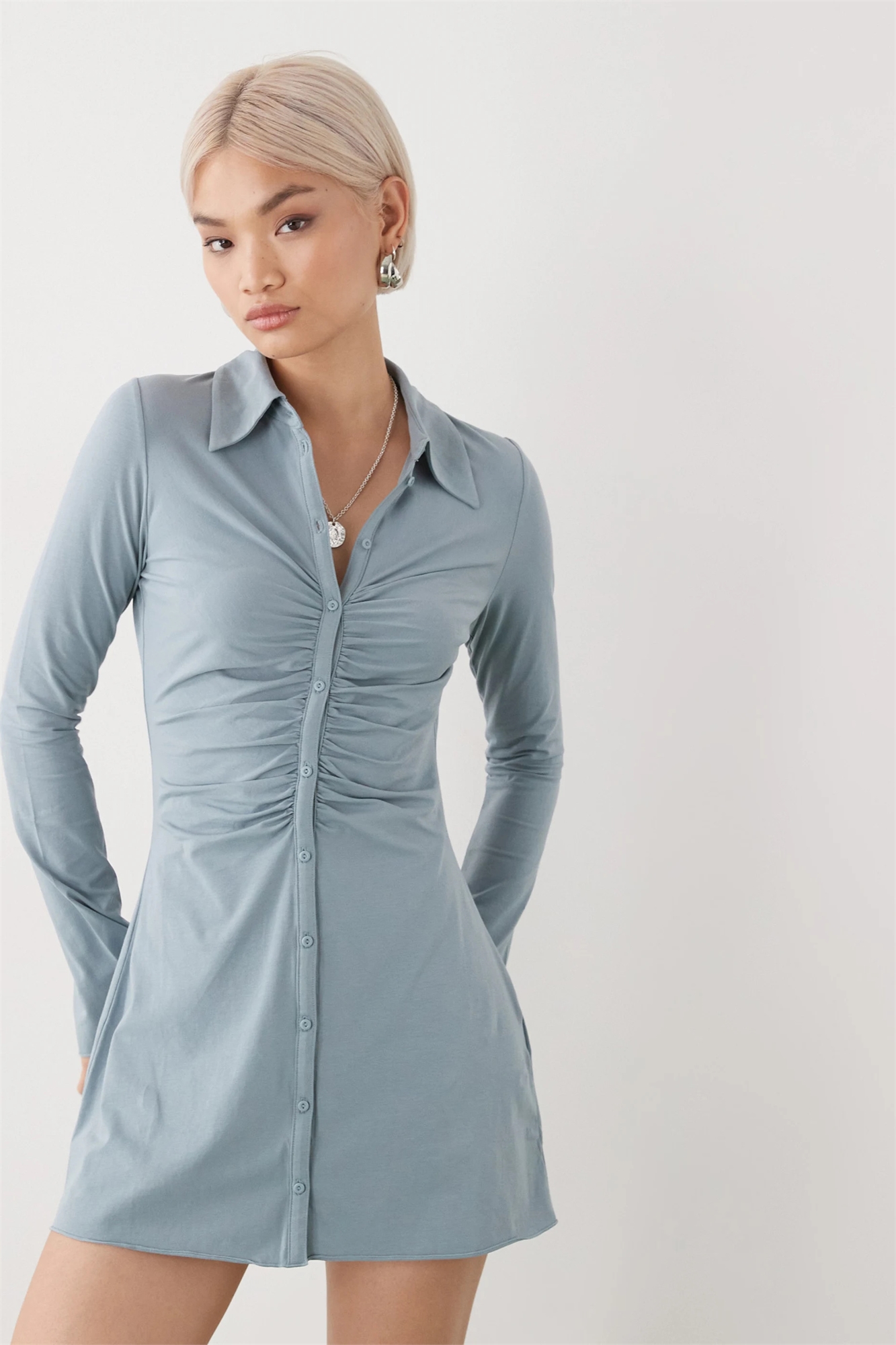 Мини-платье-рубашка с длинными рукавами и рюшами спереди