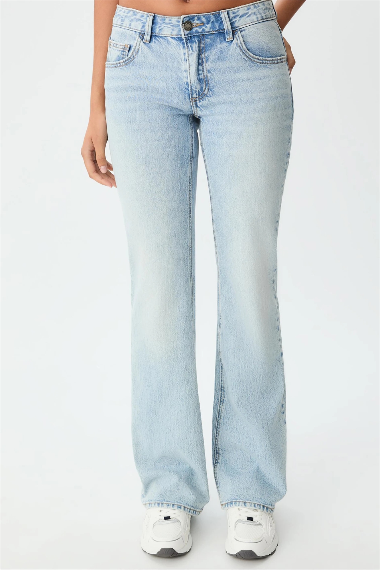 Джинсы с заниженной талией и расклешенными брючинами