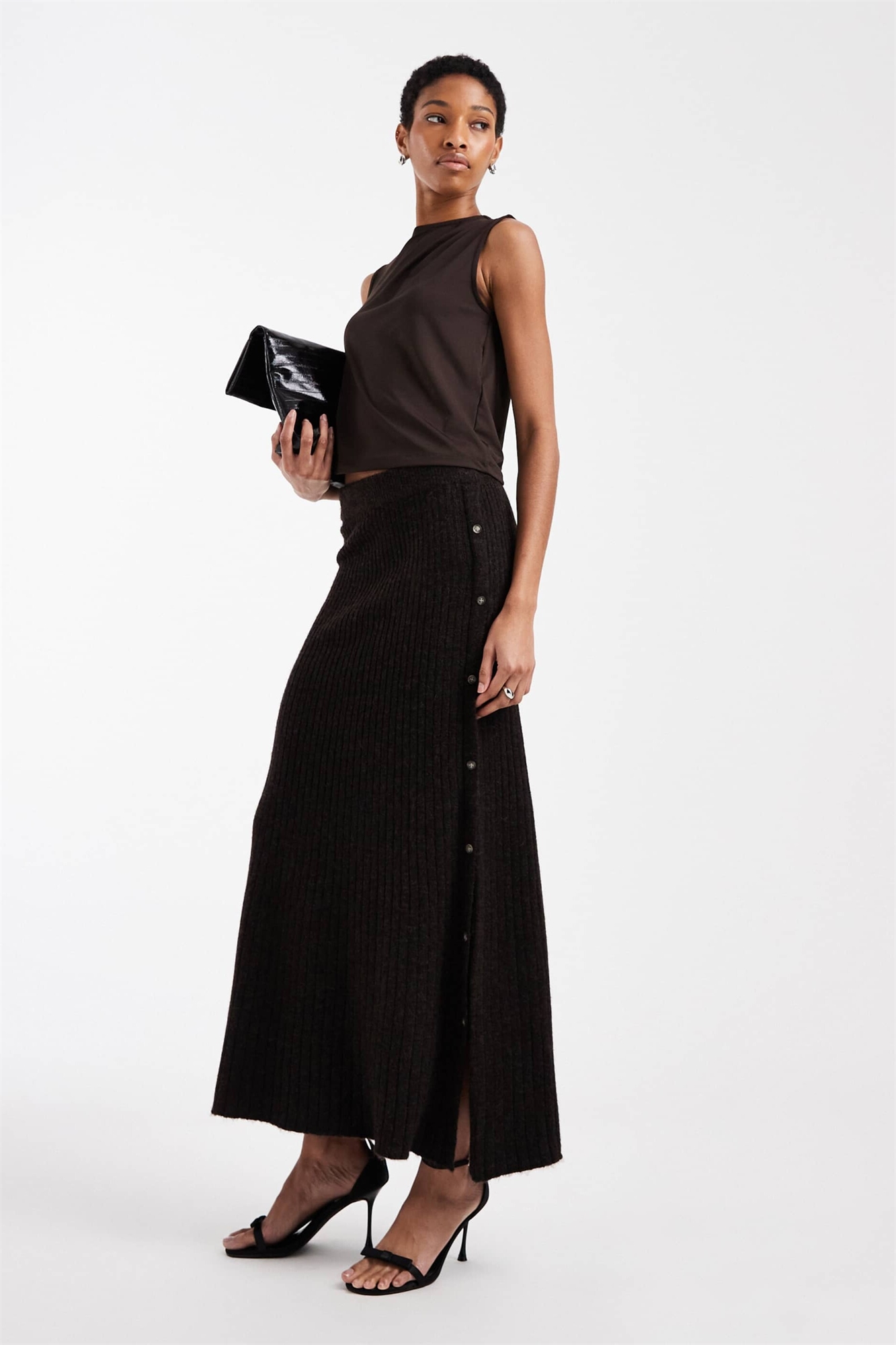 Средней длины юбка из ребристого трикотажа с застежкой на пуговицы сбоку