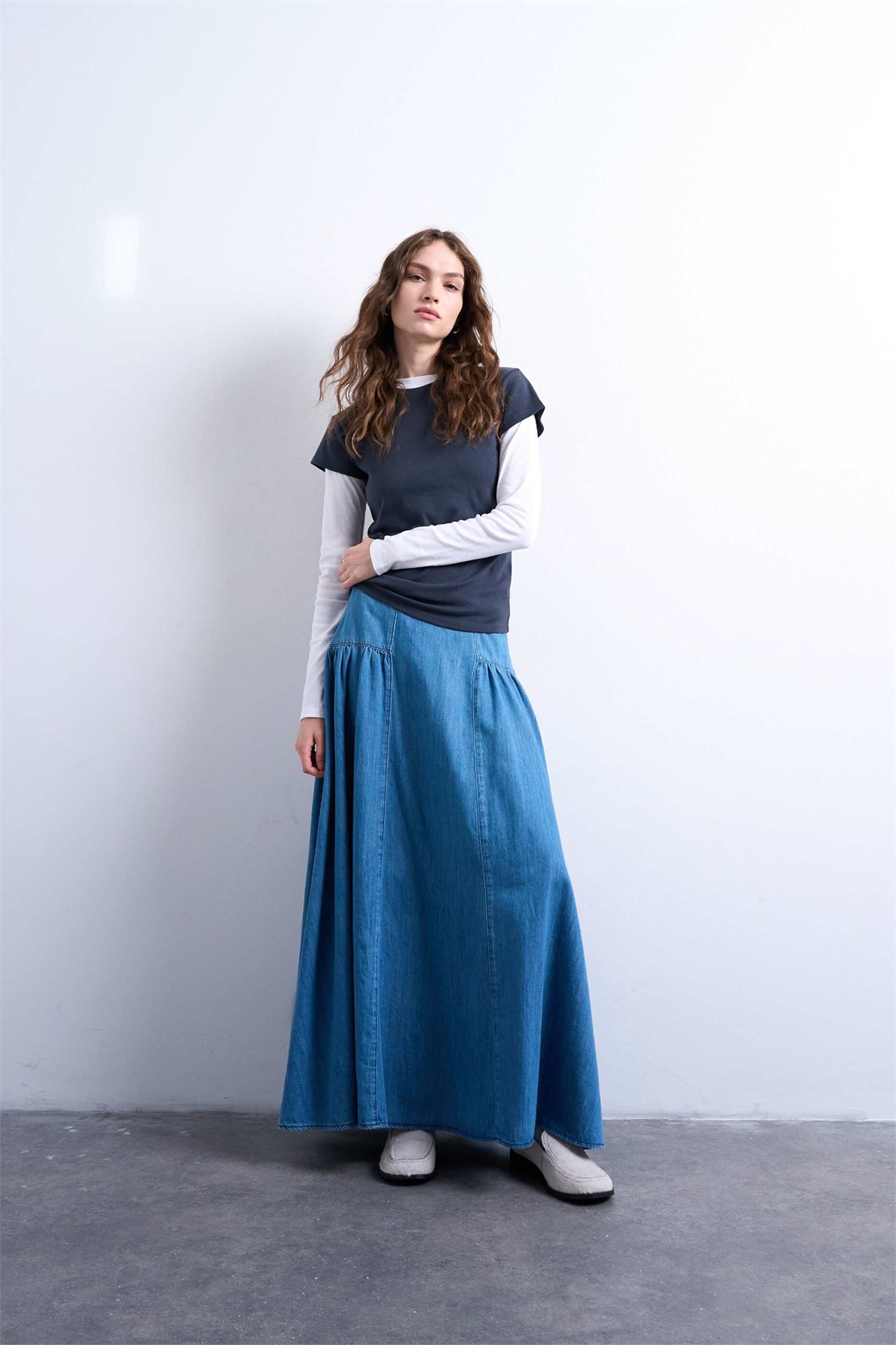 Джинсовая юбка макси с заниженной талией