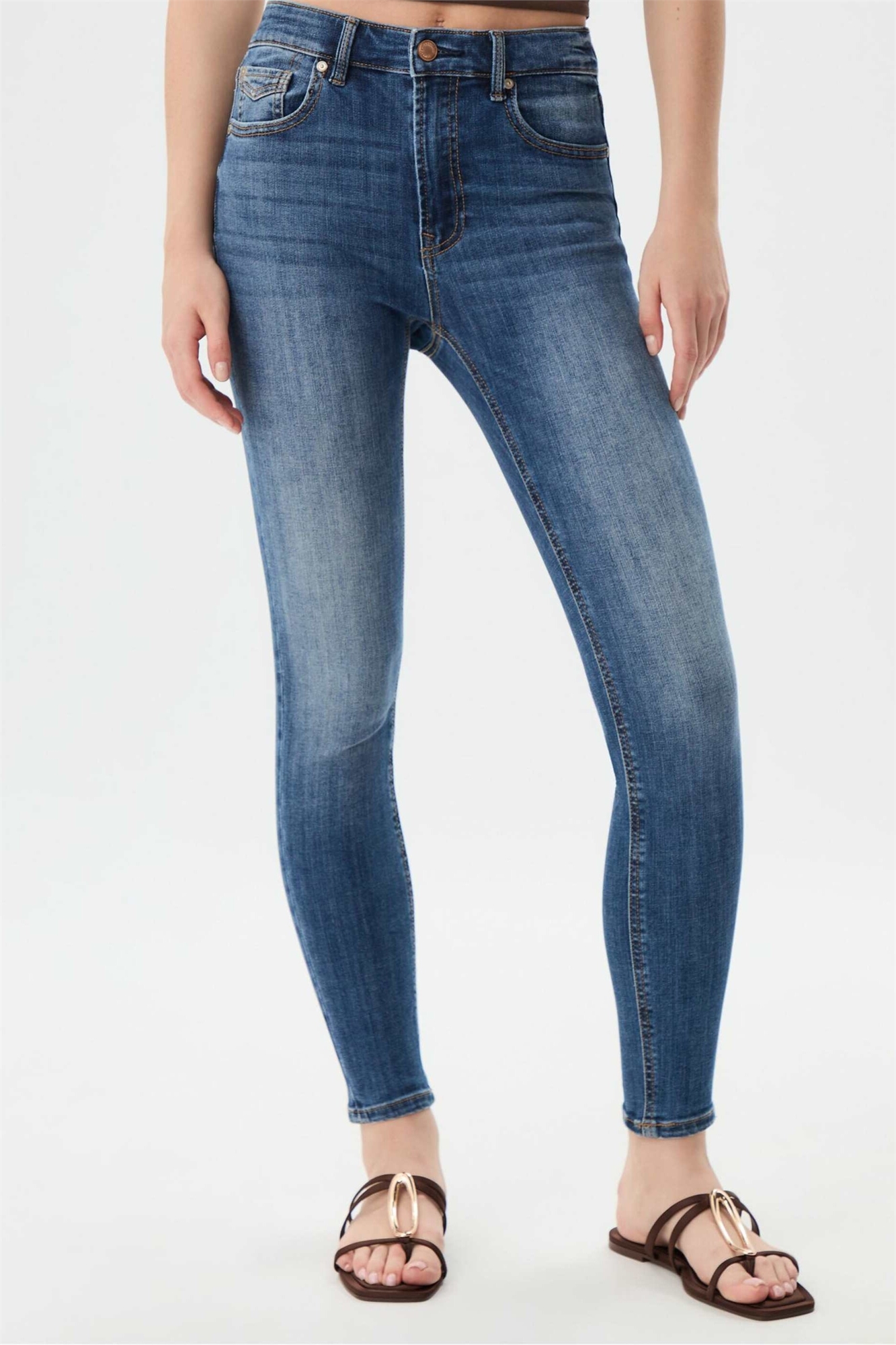 Неэластичный деним: средне-синяя отбелка Основной материал: 90% хлопок, 8% полиэстер, 2% эластан.
