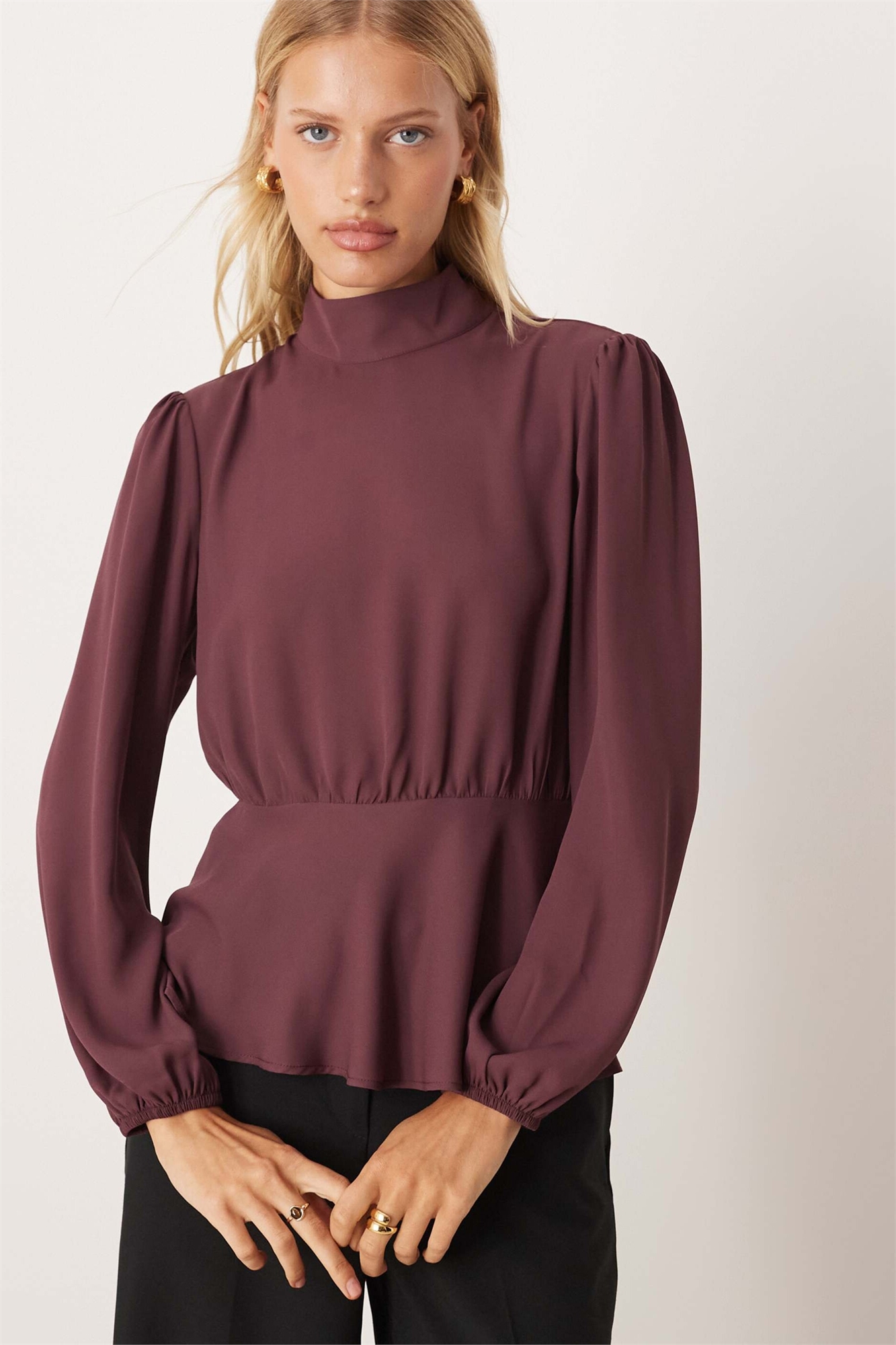 Блузка с высоким воротником, длинными рукавами и пеплумом