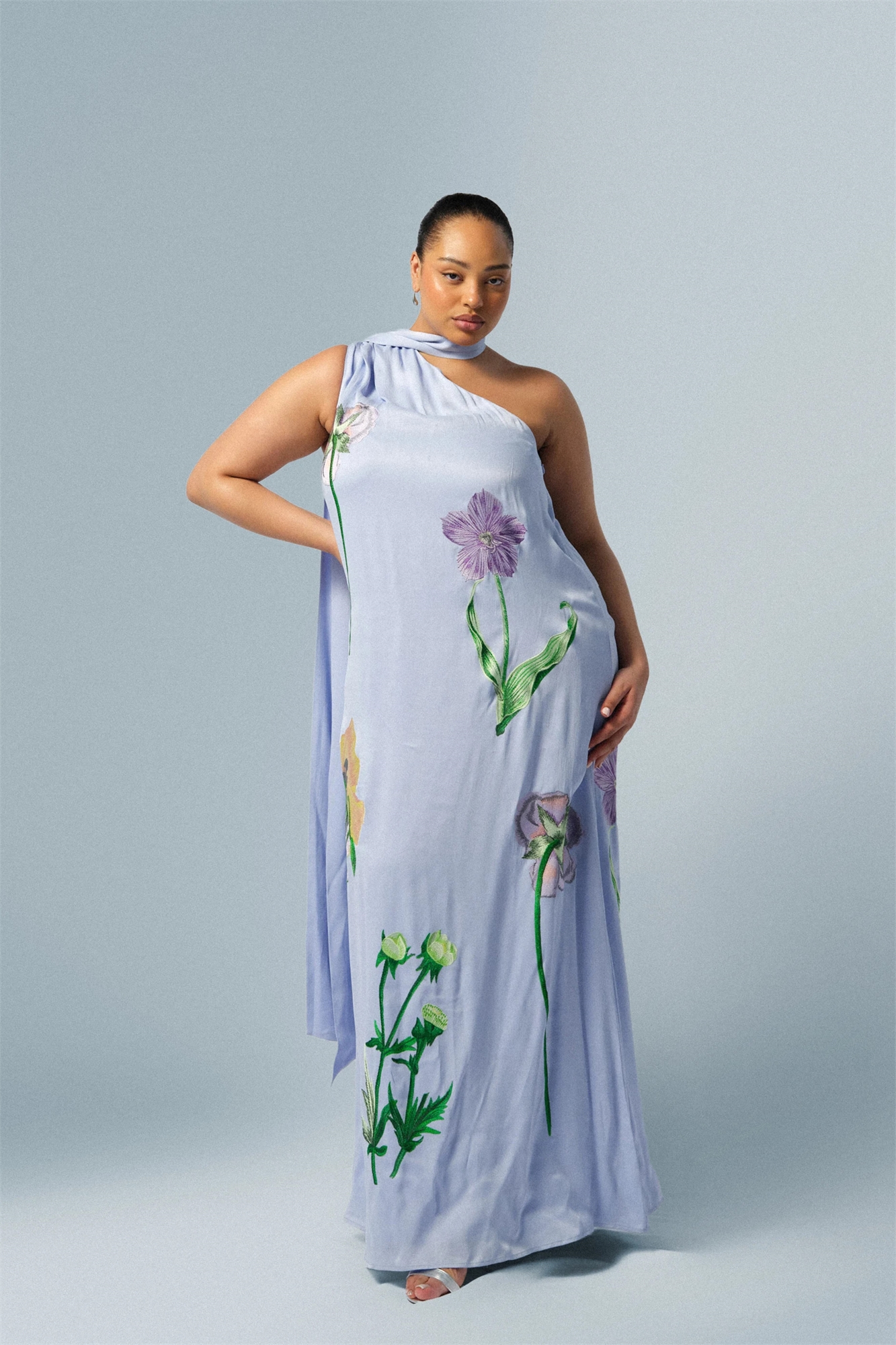 Макси-платье с одним плечом и вышивкой в виде растительных мотивов
