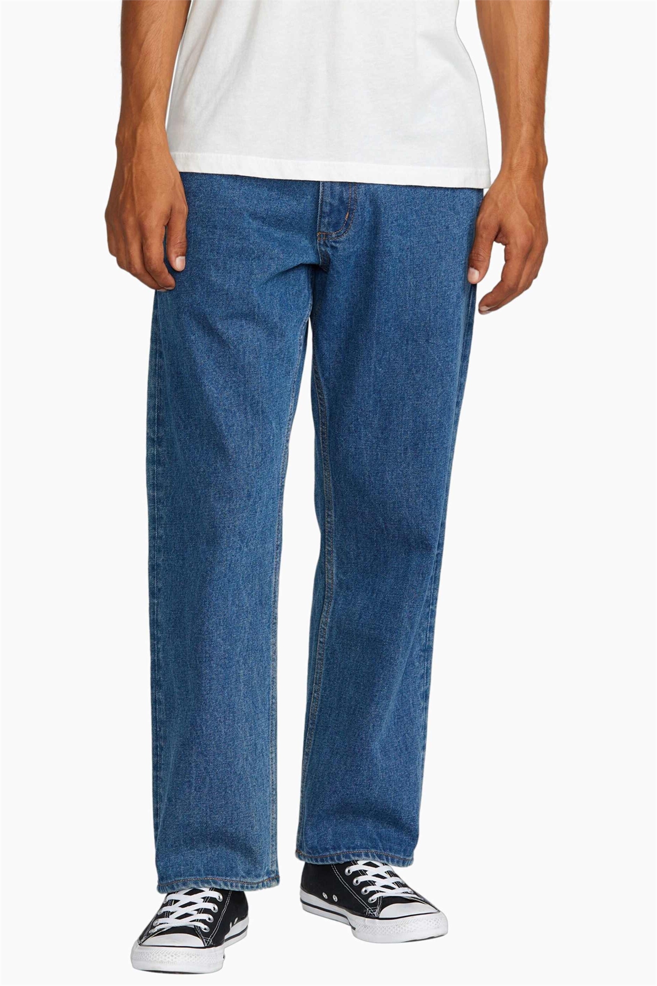 Неэластичный деним: средне-синий оттенок Основной материал: 100% хлопок.
