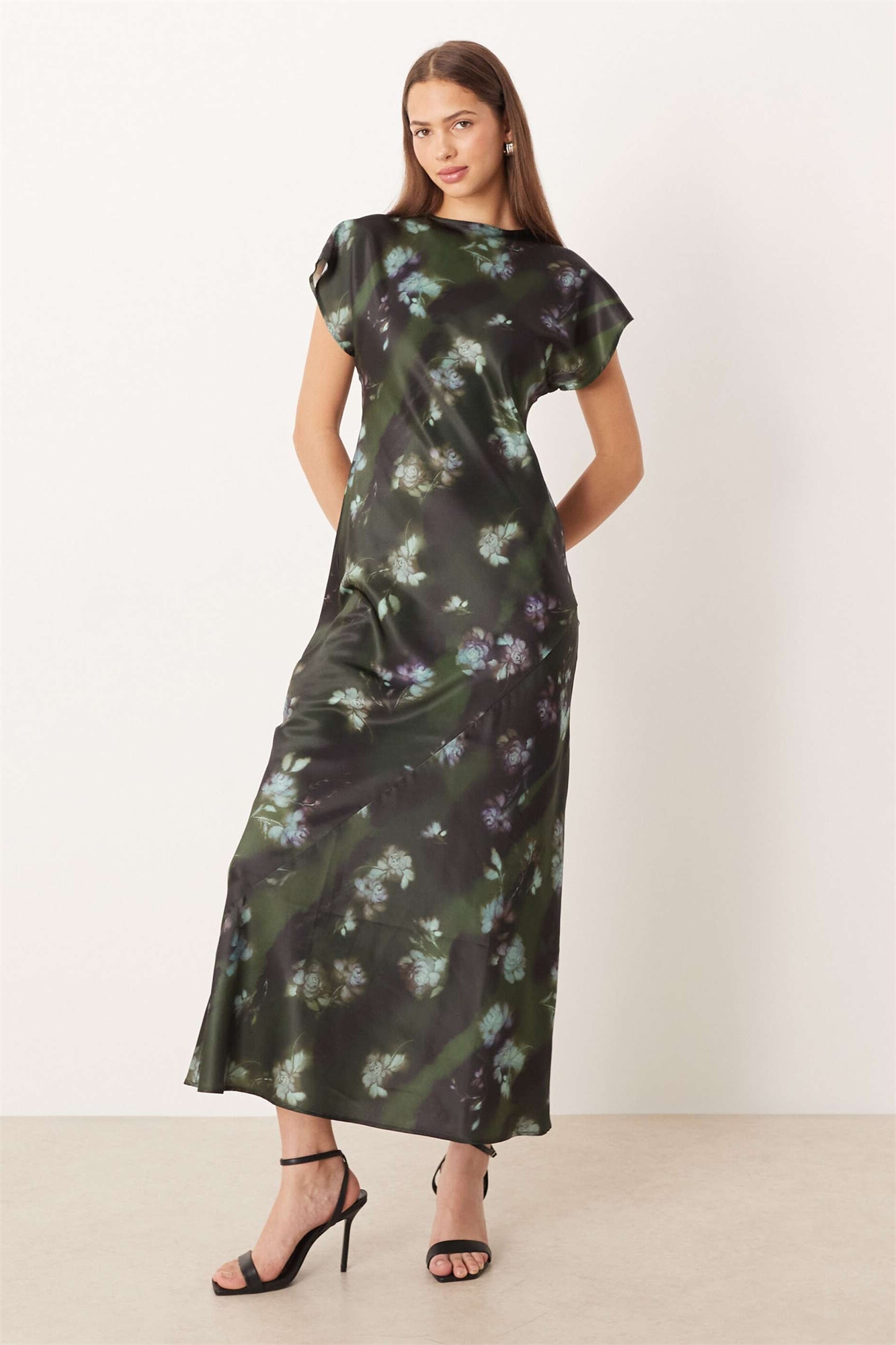 Макси-платье-комбинация из атласа с короткими рукавами и декоративными швами