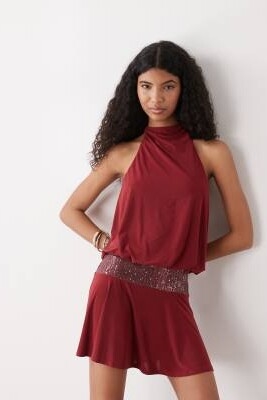 Мини-платье с завязками на шее и кружевным поясом