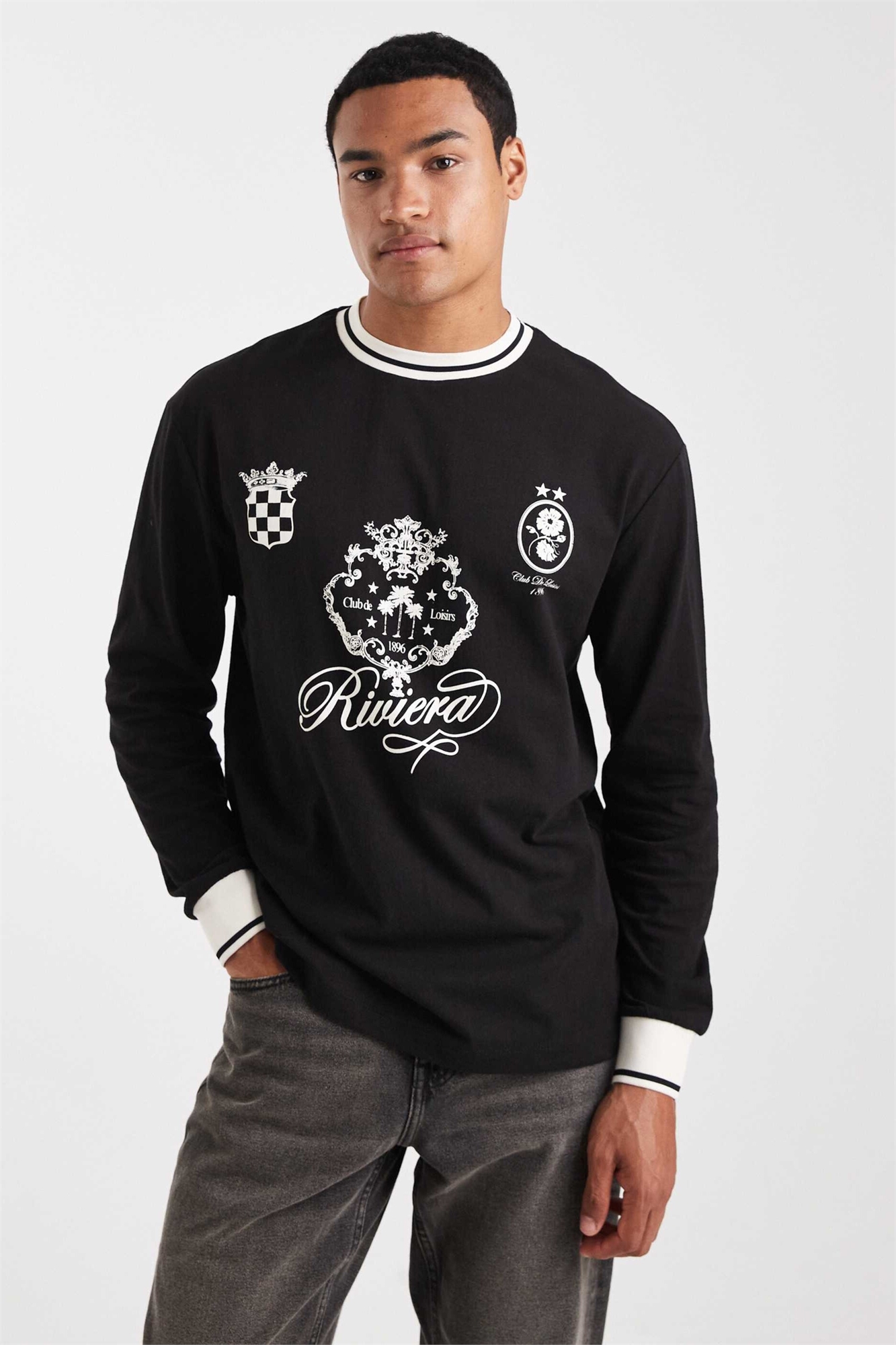 Футболка свободного кроя с длинными рукавами, отделкой в контрастный цвет и спортивным принтом