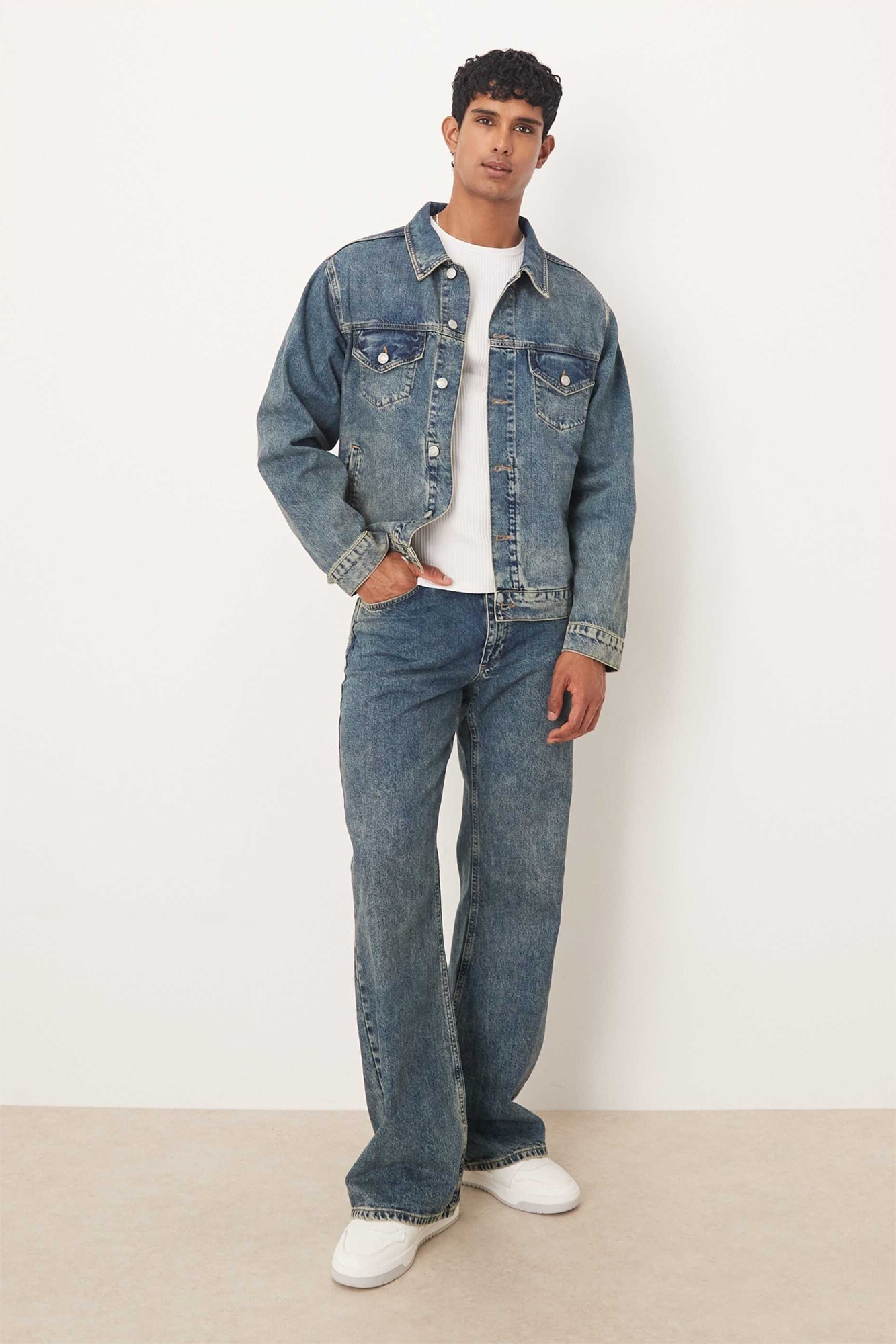 Неэластичный деним: средне-синий оттенок Основной материал: 100% хлопок.