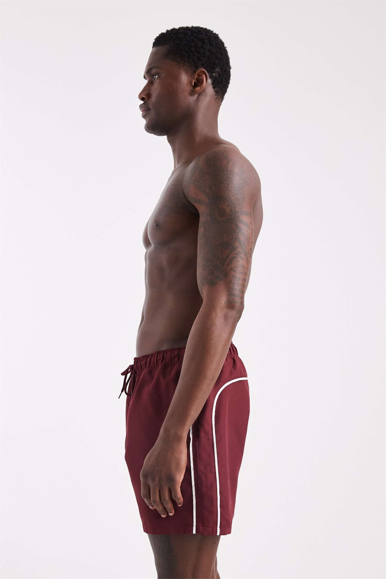 Плавательные шорты средней длины бордового цвета с контрастной белой окантовкой