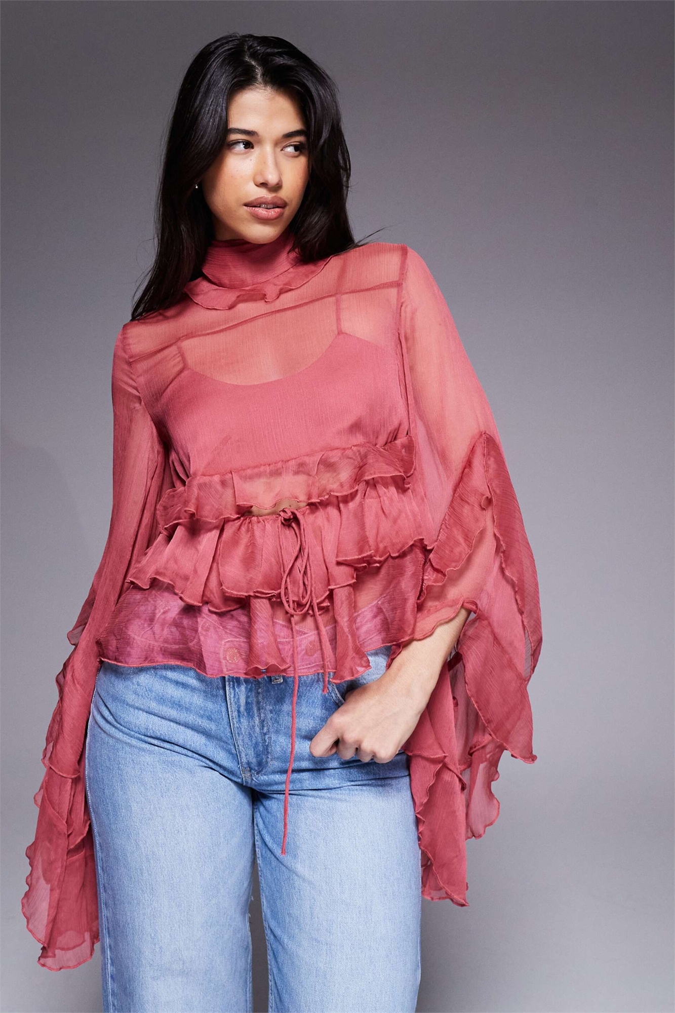Блузка Anyssa из прозрачного шифона с оборками, рукавами-колокольчиками и вырезами