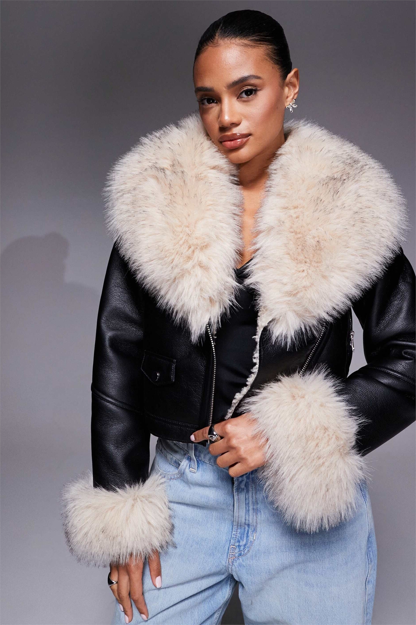 Короткая байкерская куртка с воротником из искусственного меха черного цвета