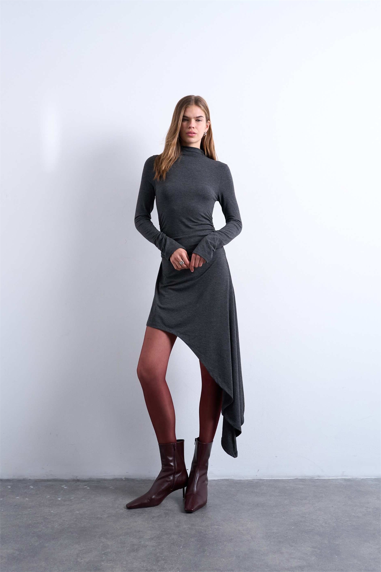 Мини-платье с высоким воротником и асимметричным подолом