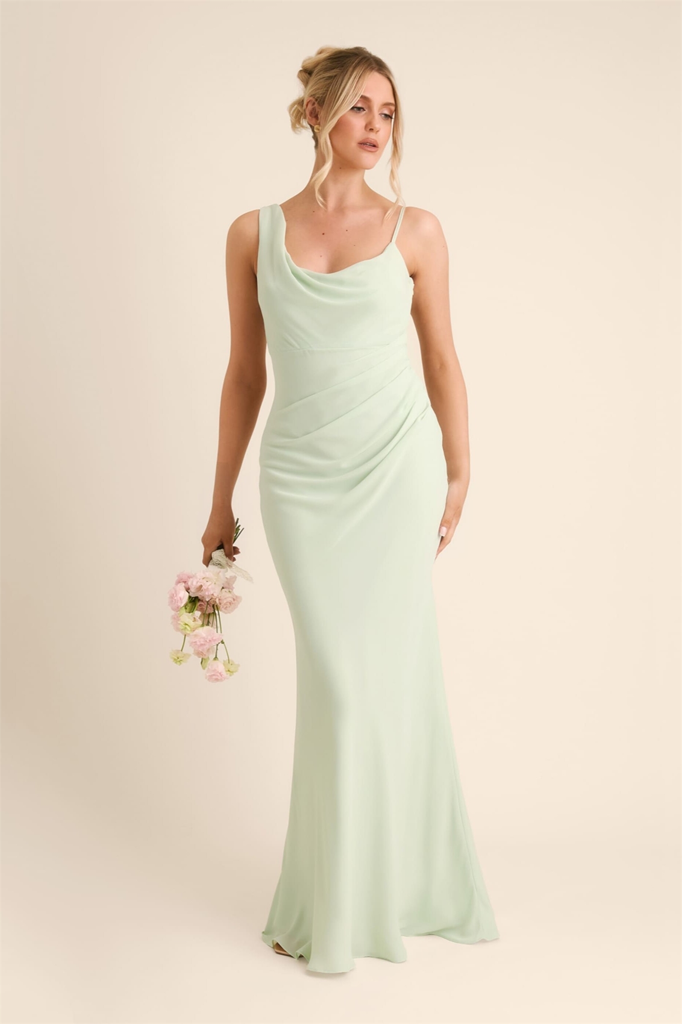 Макси-платье для подружки невесты из крепа с асимметричным воротником-капюшоном
