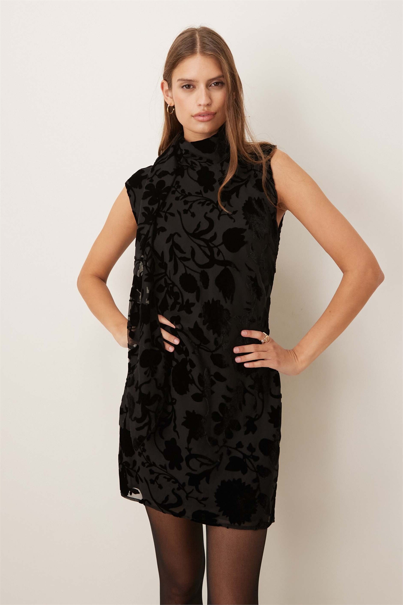 Мини-платье без рукавов с высоким воротником и жаккардовым цветочным узором