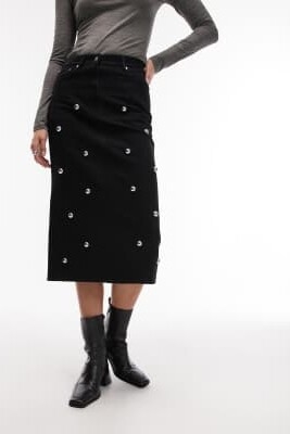 Джинсовая юбка средней длины с заклепками