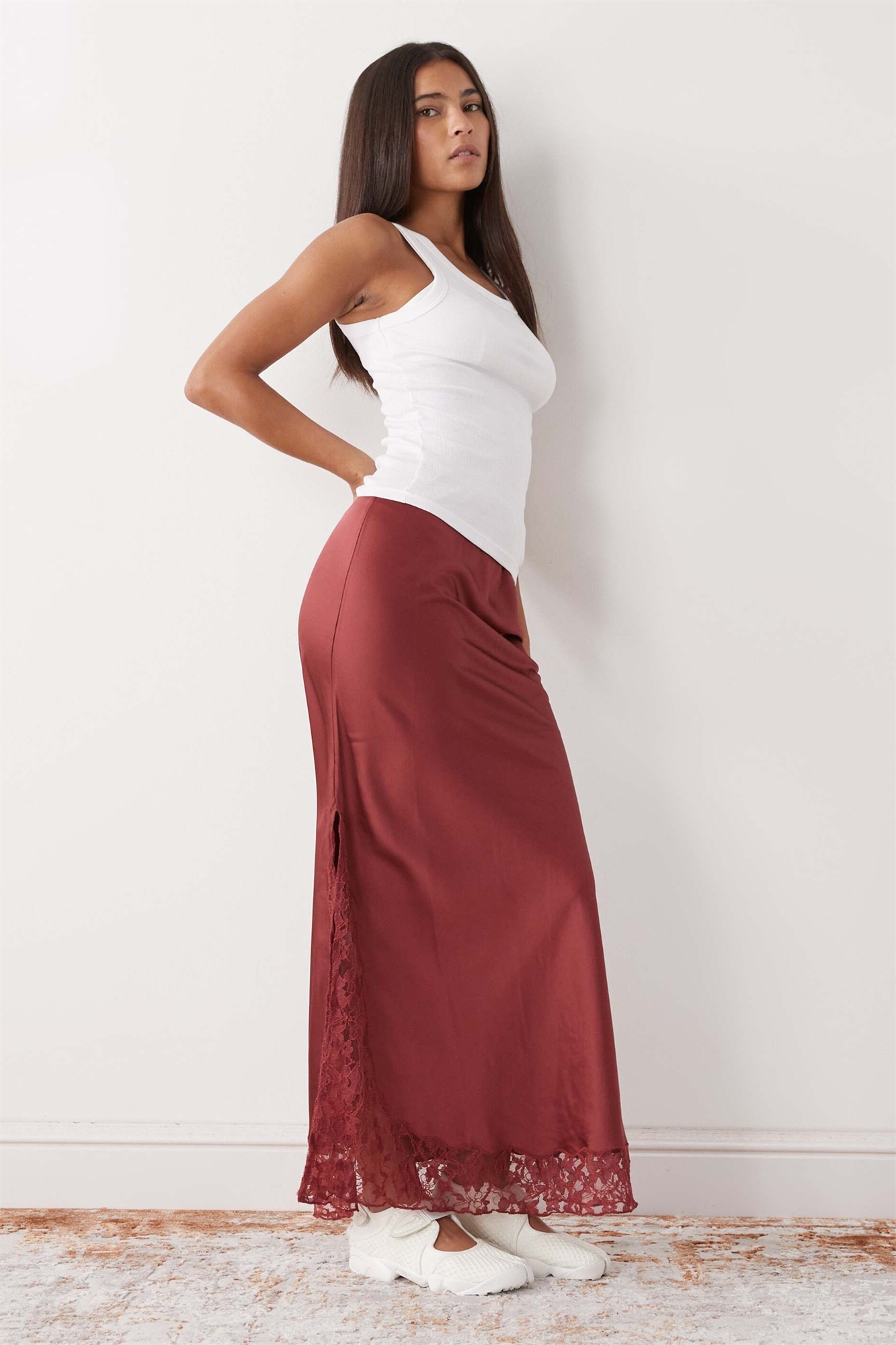 Длинная атласная юбка-комбинация с кружевными вставками