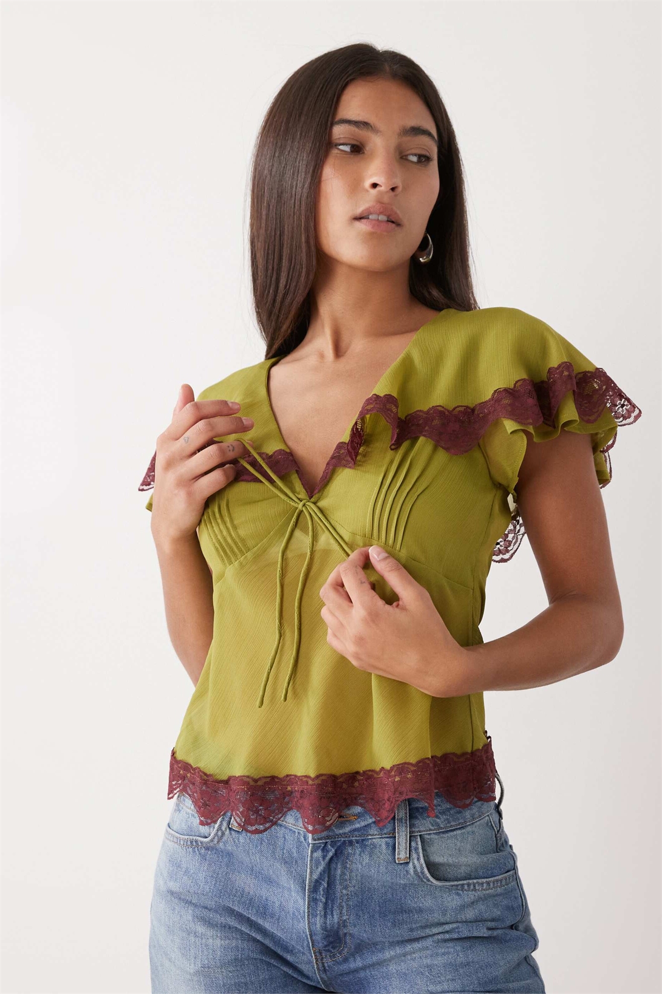 Топ из оливкового зеленого чая с контрастной кружевной отделкой