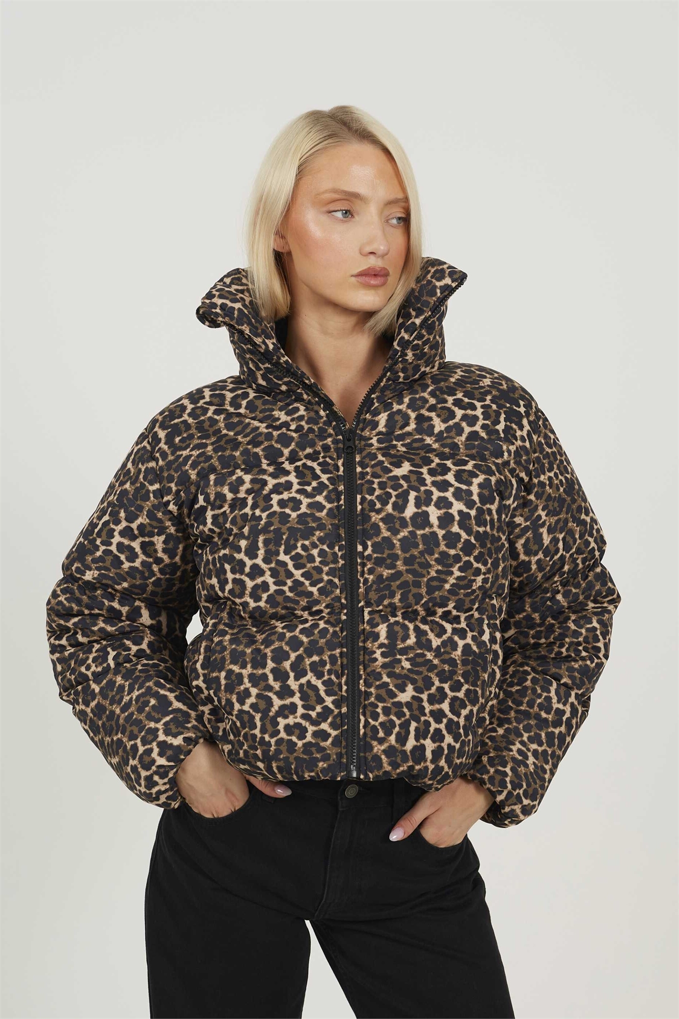 Короткая пуховик с леопардовым принтом и объемным воротником