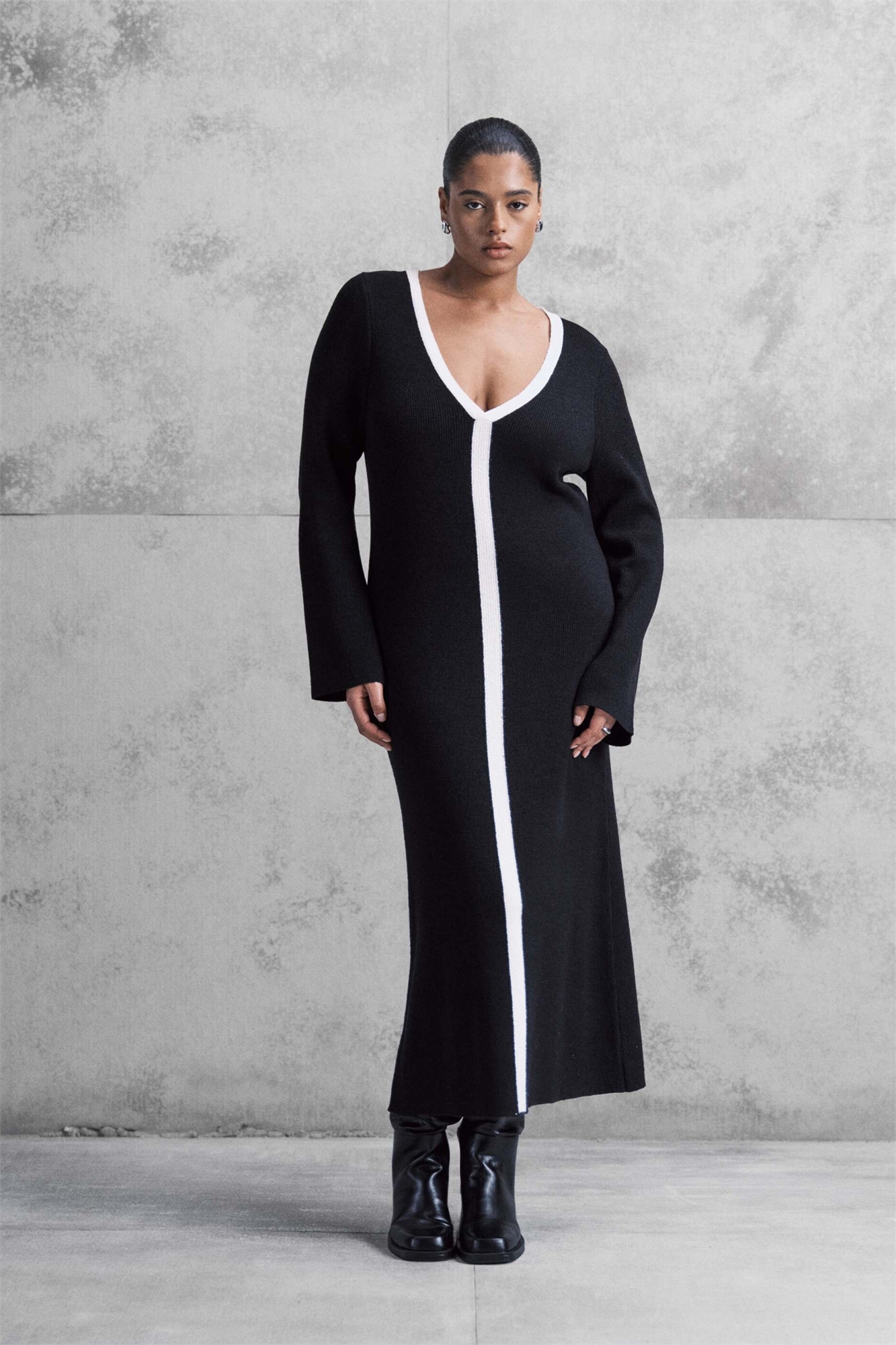 Длинное трикотажное платье с V-образным вырезом и контрастной отделкой