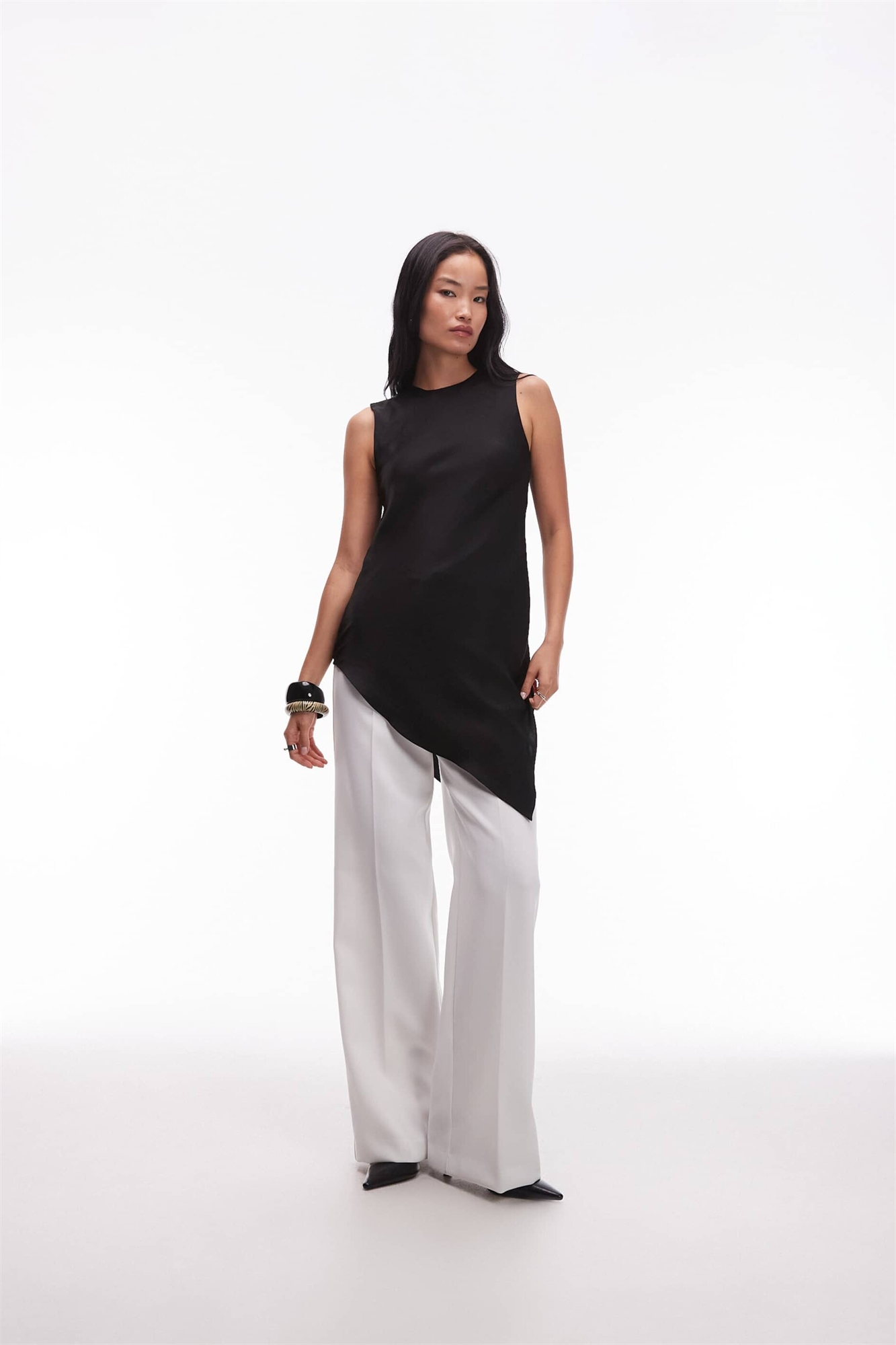 Топ из атласа без рукавов с асимметричным подолом